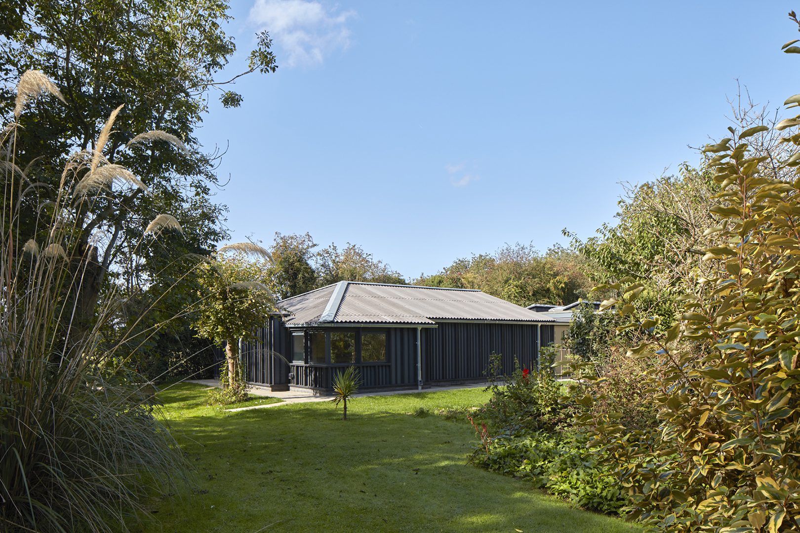 The structure lifts the building in spirit and the geometry creates a dynamic sense of movement. The roof soffit gradually slopes to a hipped bay with a corner window with views into the old orchard, defining an intimate space within a larger whole; A space to talk around the artist work with potential clients and friends. A social or more collective end for the art.