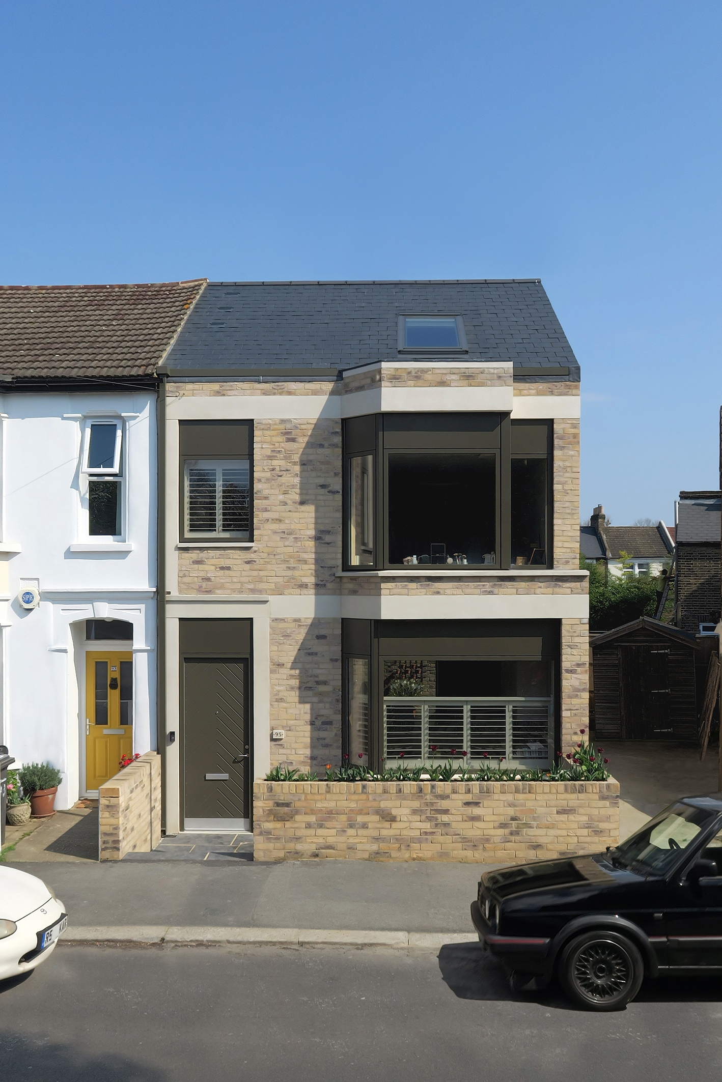 With a respectful understanding of the architectural styles of the historical heart of Brockley, the form and proportions of the bay windows are adapted into a folding of the façade while the white concrete banding continues the Victorian datums of the street along the elevation. The natural variety in the brickwork is broken by dark bronze fenestration and over panels, allowing for slim sightlines and maximising natural daylight to the interior. As the ground floor is sunken into its surroundings, these over panels conceal the structure behind, creating an optical illusion from the street where a three-storey building with generous ceiling heights fits into a typically two-storey terrace building volume.
