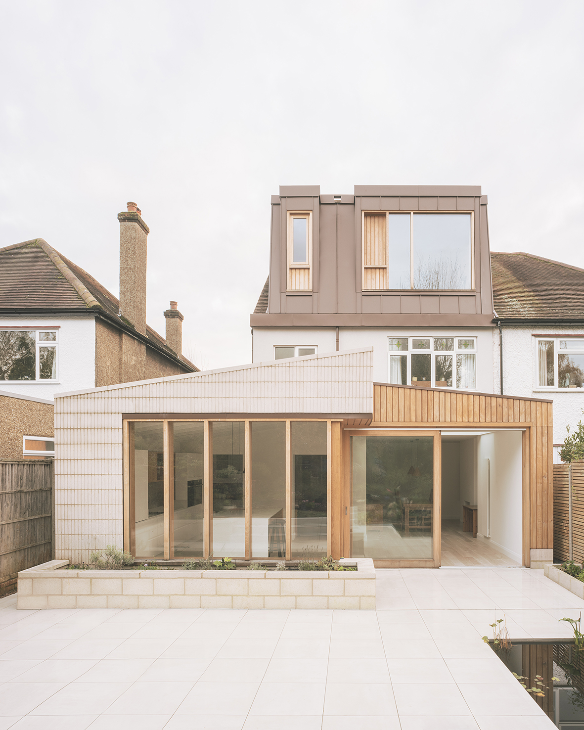 The use of oak detailing throughout consolidates the spaces; from the ground floor glazing, up the staircase, culminating in the loft picture window. A subtle yet distinctive material palette was developed. Considered detailing allowing for simple and robust materials; burnished blockwork, oak and pigmented zinc to be thoughtfully composed.