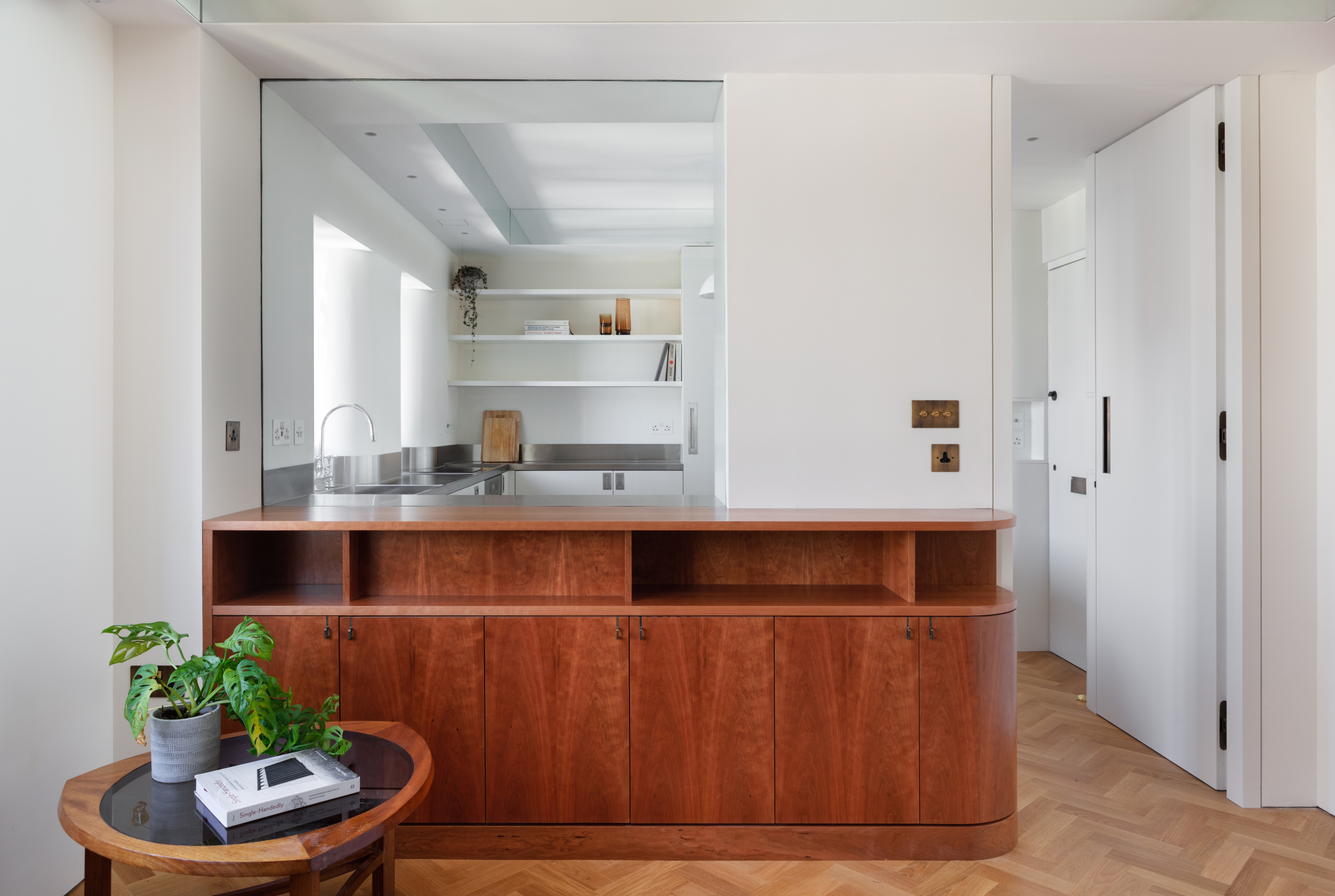 Between the kitchen and living room is a clear glass fire-rated screen allowing light and long views through the flat to maximise the sensation of space. Ceilings respond to the spaces below, with higher coffers between the down-stand concrete beams. The bulkheads to these beams are lined with mirror continuing the illusion of space and luxury.