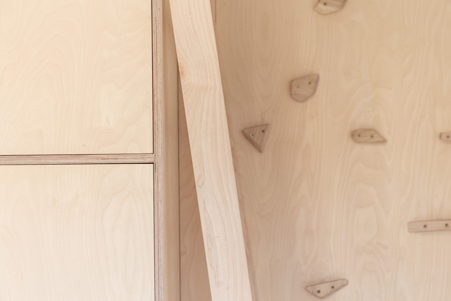 Playfully working with the new opened up ceiling height within the bungalow, a mezzanine structure is created within the children's bedroom with a climbing wall and ladder inserted for access, built entirely from birch plywood.