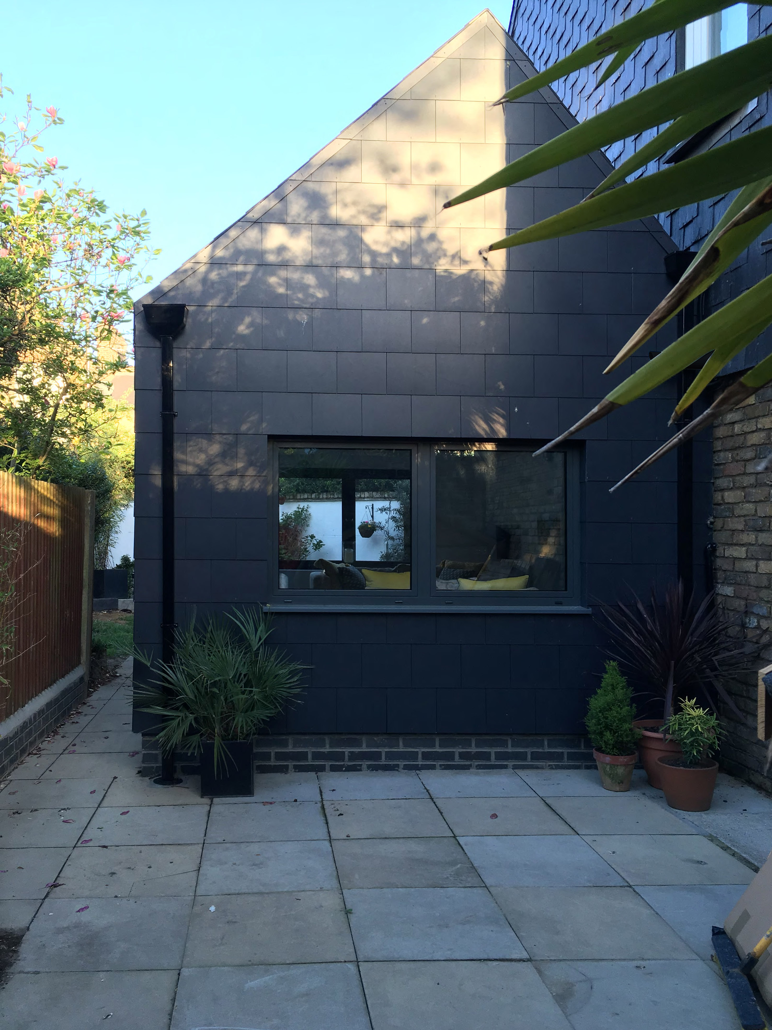Barely visible from the front, like a secret garden shed, the projecting building attached to the house shapes the external space, forming a hidden courtyard on the side which further disrupts the terraced house, strip plot morphology. The new addition is an inscrutable caped form, its envelope cloaked in dark grey artificial slates, of a larger format than those on the host building. It creates a collage assemblage of grey slate clad pitched forms.