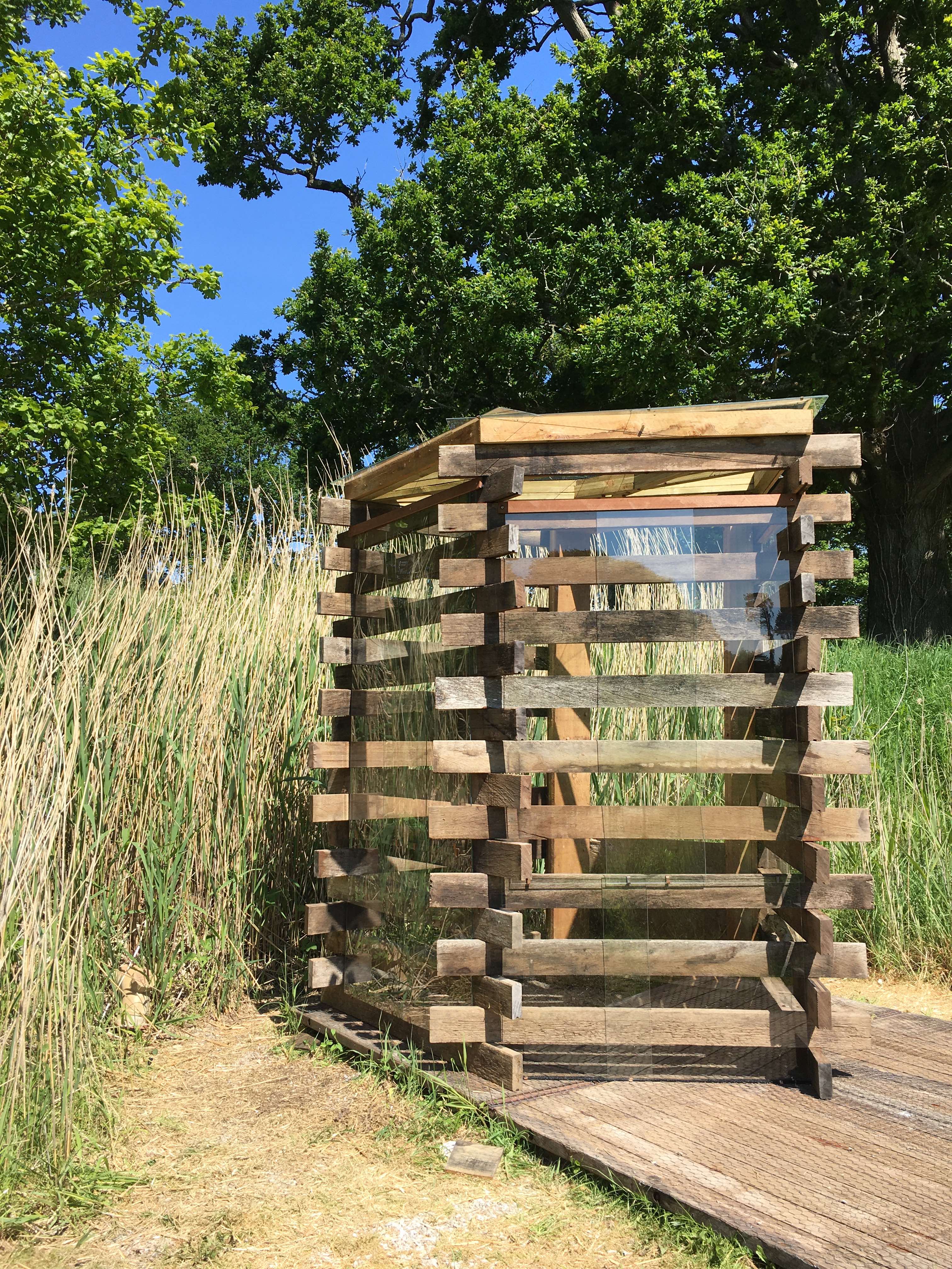 However, some threaded bar, now rusted pins, got stuck in the existing pre-drilled holes. Soaking them in the small leat, adjacent to the house, the wood expanded releasing the steel pins to re-use in the stacking of the timber; pin jointed at the staggered jointed corners formed a Pentagon enclosure mounted on four ground boards within the reed bed.