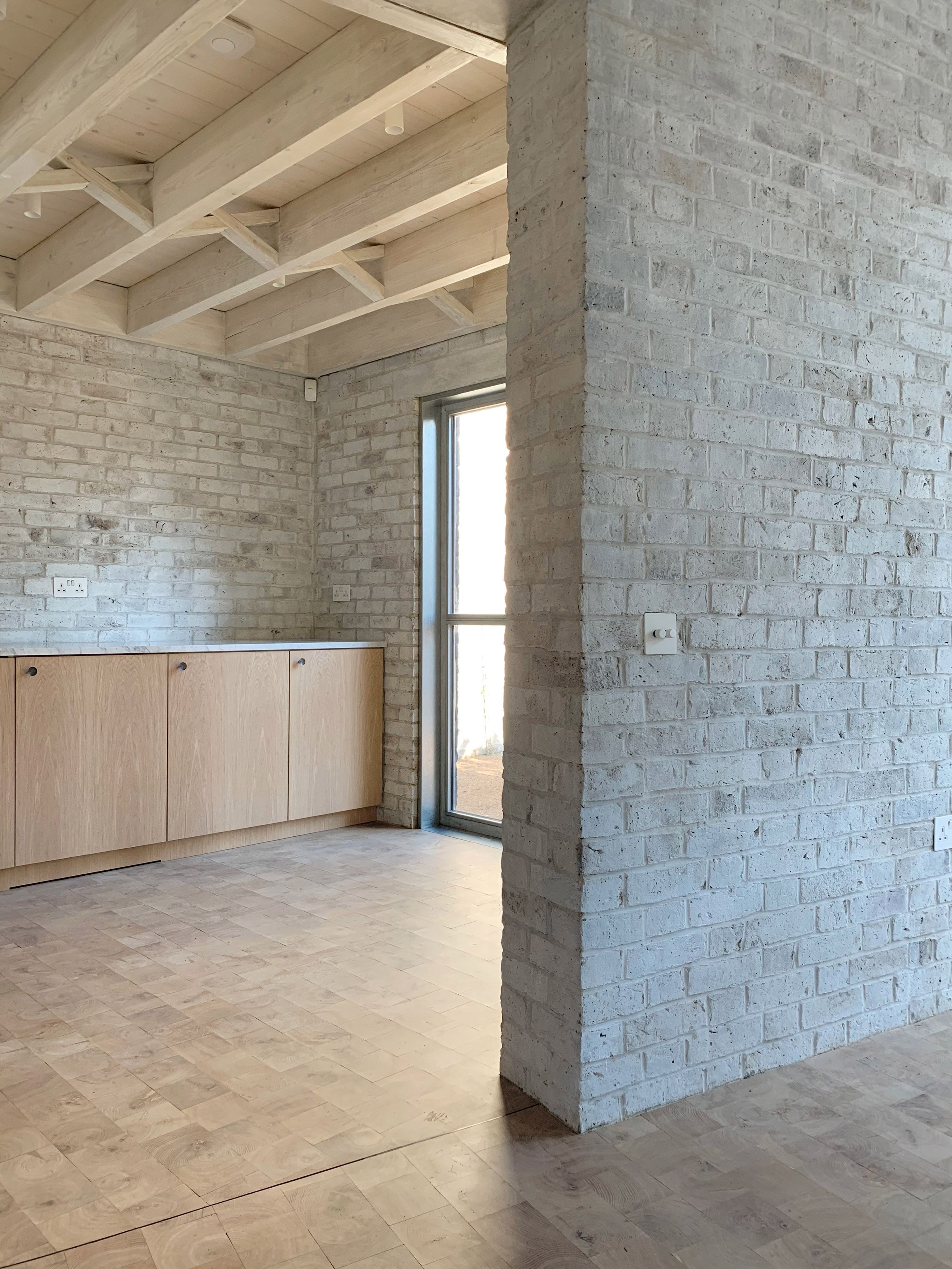The material palette – mineral-washed brickwork inside and out, exposed ceiling joists, galvanised steel window frames, end-grain woodblock flooring – references more traditional garden buildings while at the same time creating internal spaces with a strong material character of their own.