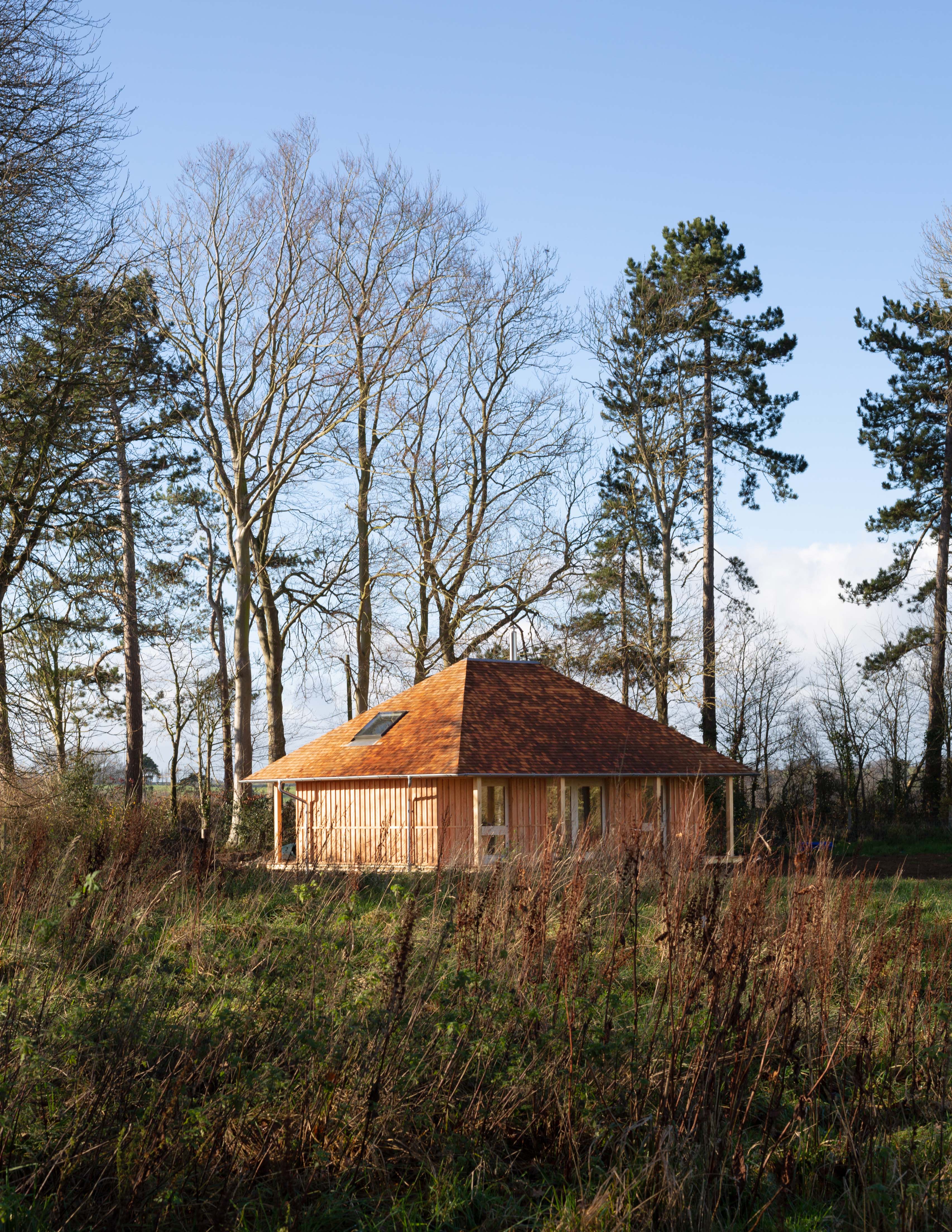 Externally the structure is clad in locally sourced larch and cedar shingles, and the deck is framed by a series of oak columns. The building is conceived as one which is drawn from the landscape, and can eventually return to it – the entire structure being effectively compostable.
