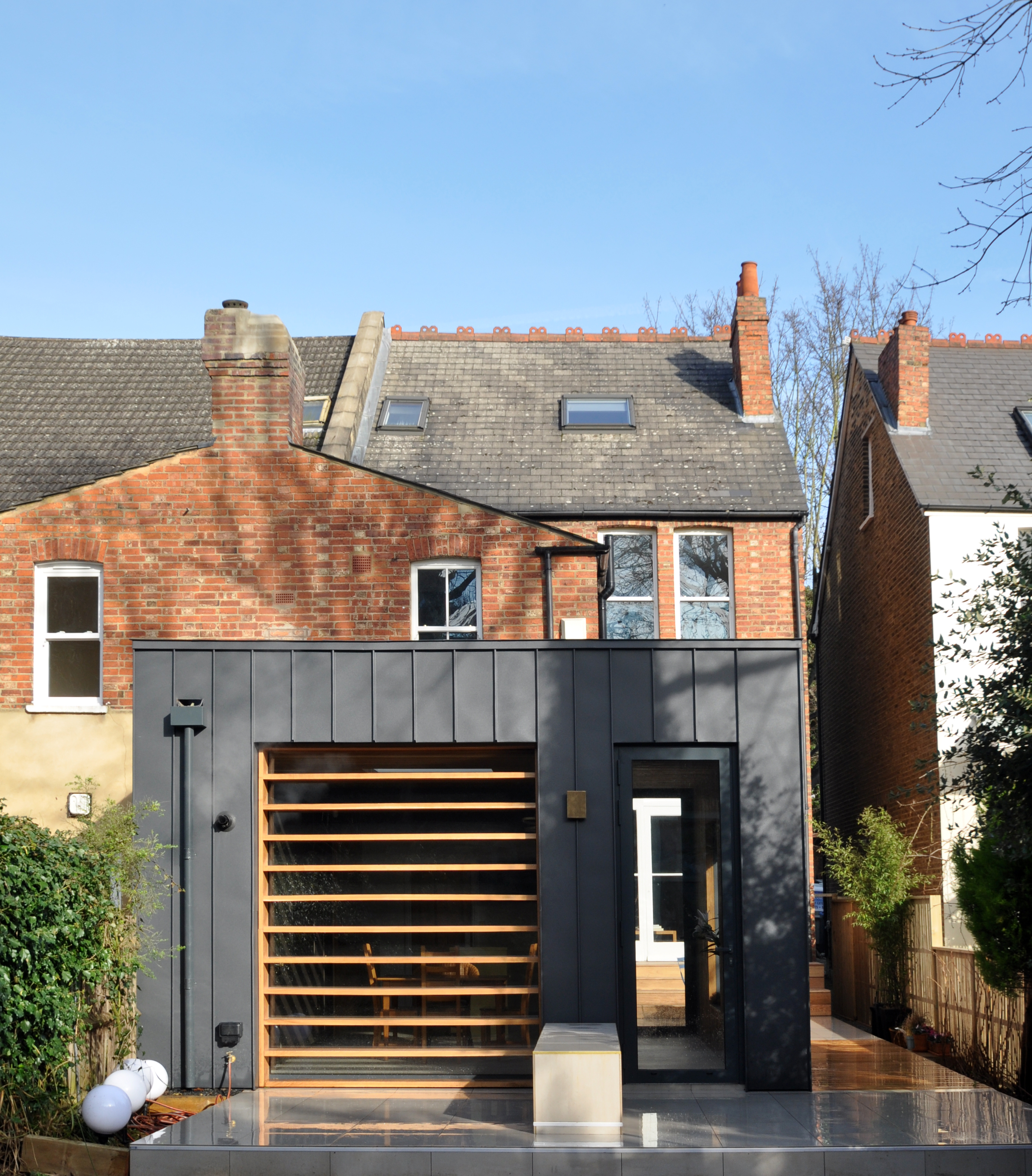 The new, light-flooded kitchen and dining area follows the same principles. It consists of exposed oak plywood and dark grey units and has a striking brushed brass island at its heart. Oak slats wrap up the wall and over the ceiling. Where they stop short, they provide striking framed views while they also run over a skylight to contribute to solar gain prevention. An existing small basement has also been transformed into a new utility area.