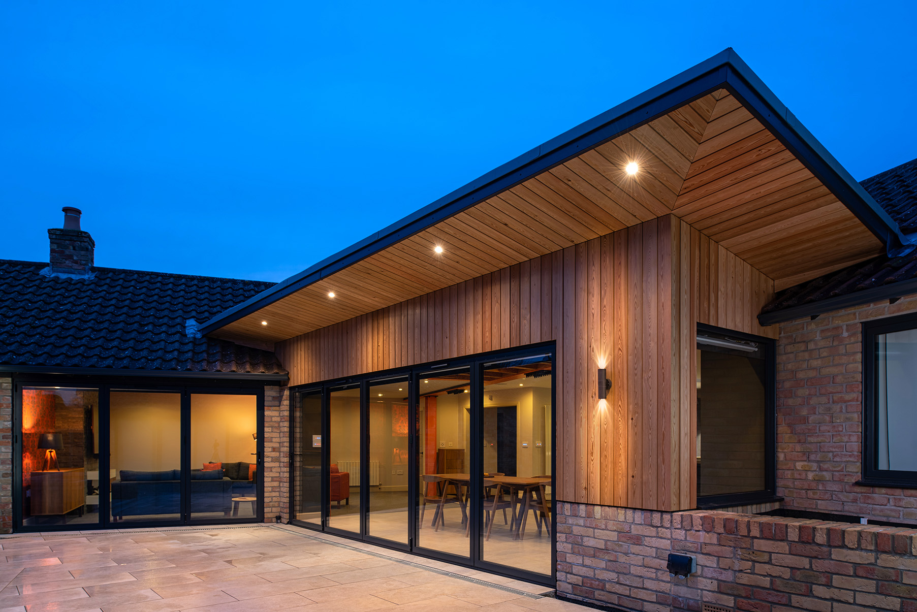 To achieve this, our scheme removed an internal corner from the existing building and inserted a wedge-shaped extension into the courtyard which opened the internal space. Additionally, the scheme included a package of voice-operated smart home technology and a personalised kitchen tailored to our client’s needs.
