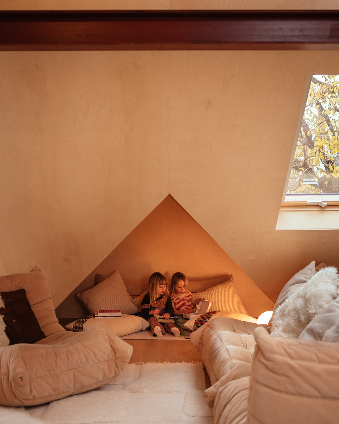 As you climb upwards through the darker historic parts of the family home you transition into a warm and inviting light-filled loft space lined in birch ply