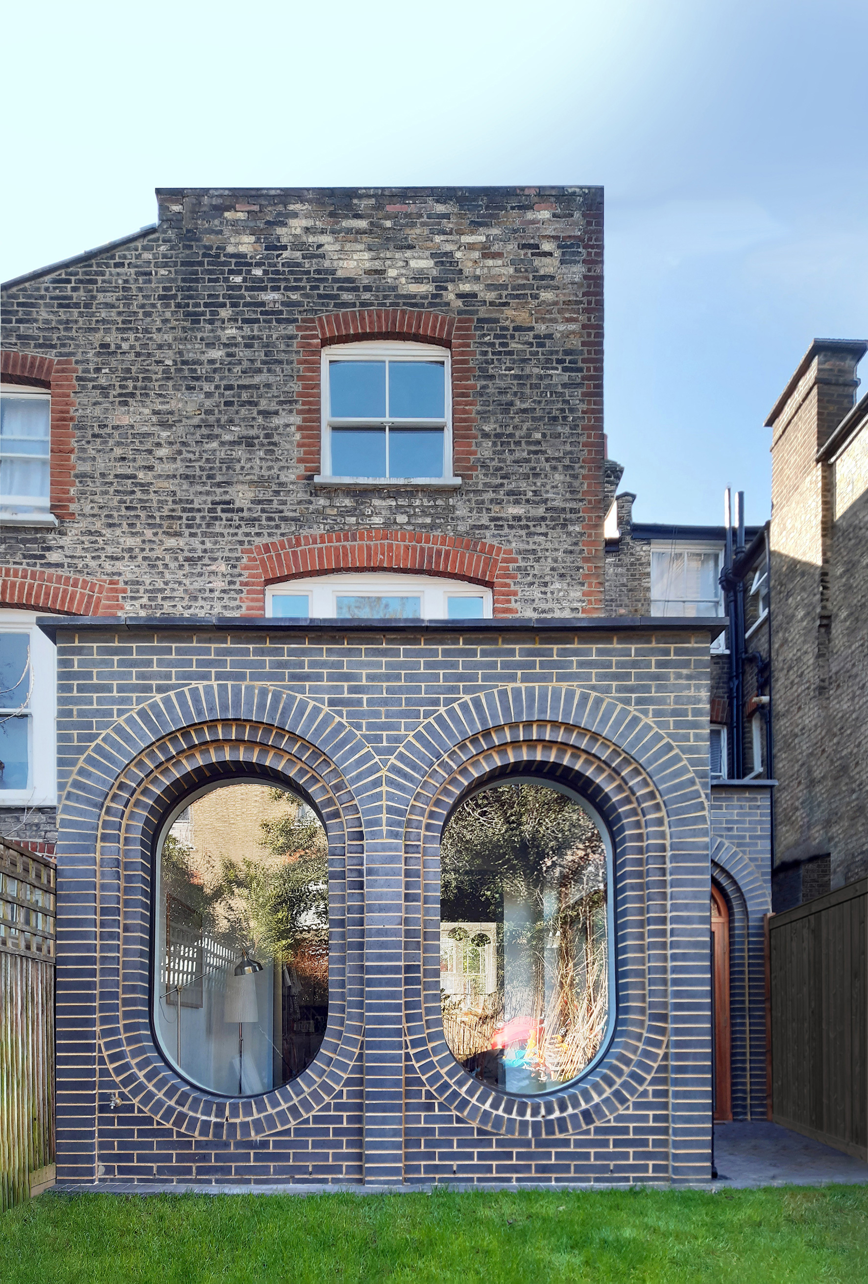 Two giant lozenge-shaped picture windows in self-supporting brickwork articulate the new garden elevation with stepped lines of brick headers, highlighted with a surrounding, protruding soldier course around the head arch. These continue to ground forming three-stack bonded pillars. A new ‘back door’ to the rear of the side extension has similar detailing, and a wide arched opening with sliding folding doors to the side of the rear extension completes the arrangement.