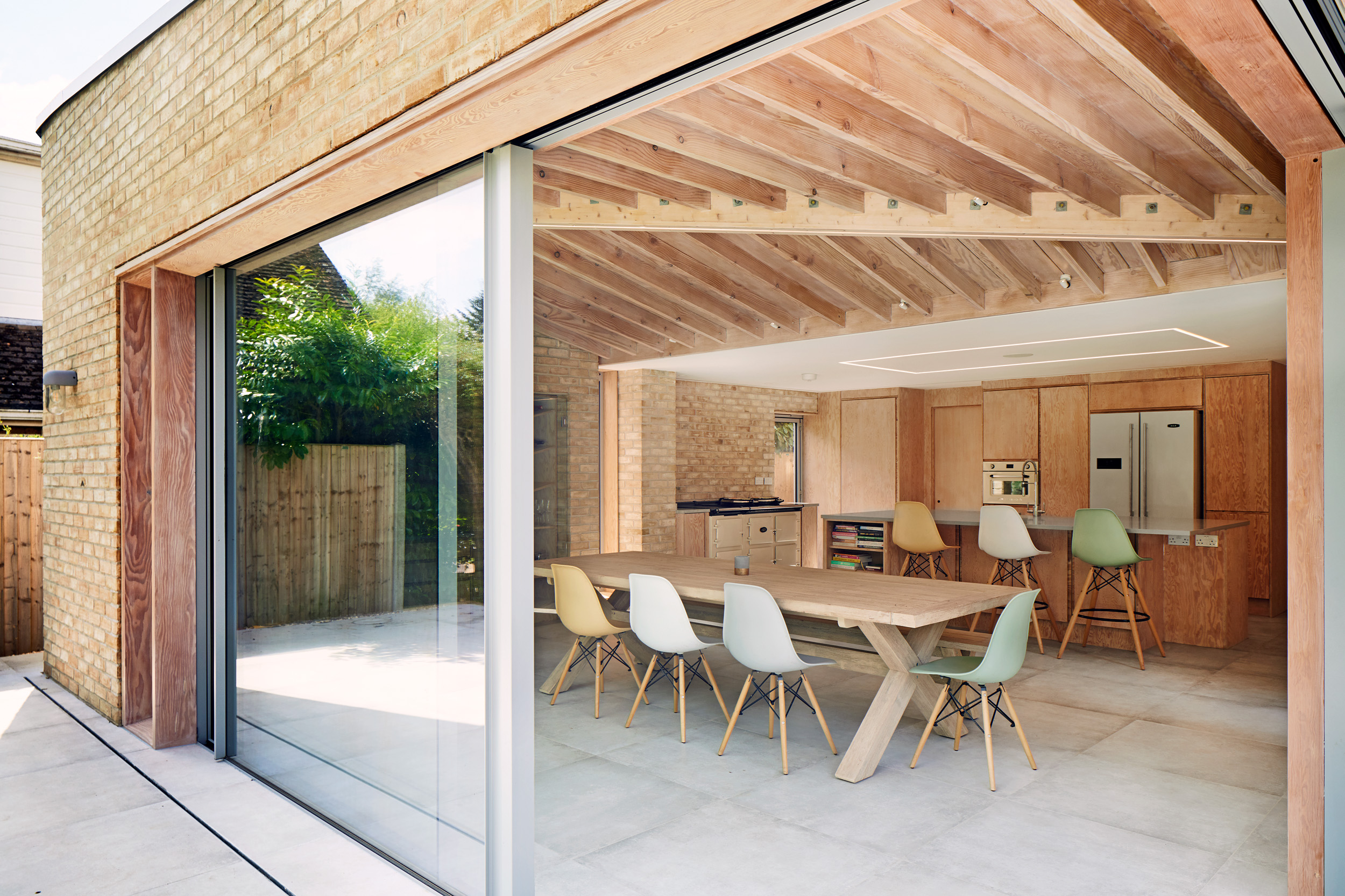 The form of the roof was influenced by the need to create taller ceilings than the existing, transitioning from old to new without a step at the interface. It rises to a point on one side to give privacy from the neighbours and then drops on the other to reduce window size and solar gain. The result is a simple but elegant exposed structure, which hopefully lifts the spirit. The brickwork is returned from the outside to the inside and the Douglas fir structure is reflected in the Douglas fir ply kitchen. The lighting is simple and discrete shifting the focus to the timber form.