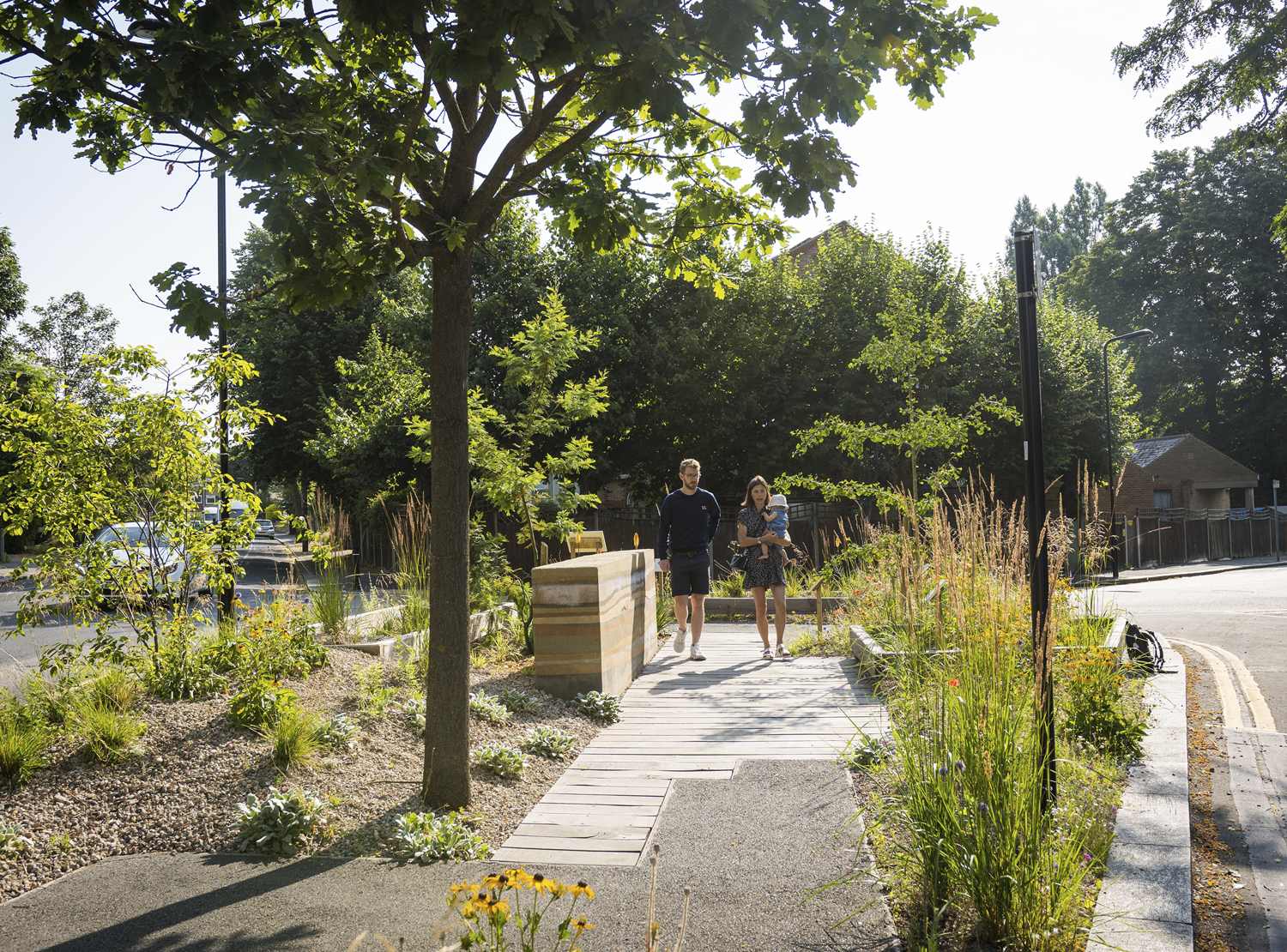 Large areas of impermeable tarmac have been replaced with recycled building aggregate, sand, gravel and timber - allowing natural rainwater runoff to percolate the ground rather than running off into mains drains. The use of water retention planting and ‘rain gardens’ is to ensure rainfall is recycled to water the planting, while reducing the burden upon drainage infrastructure.