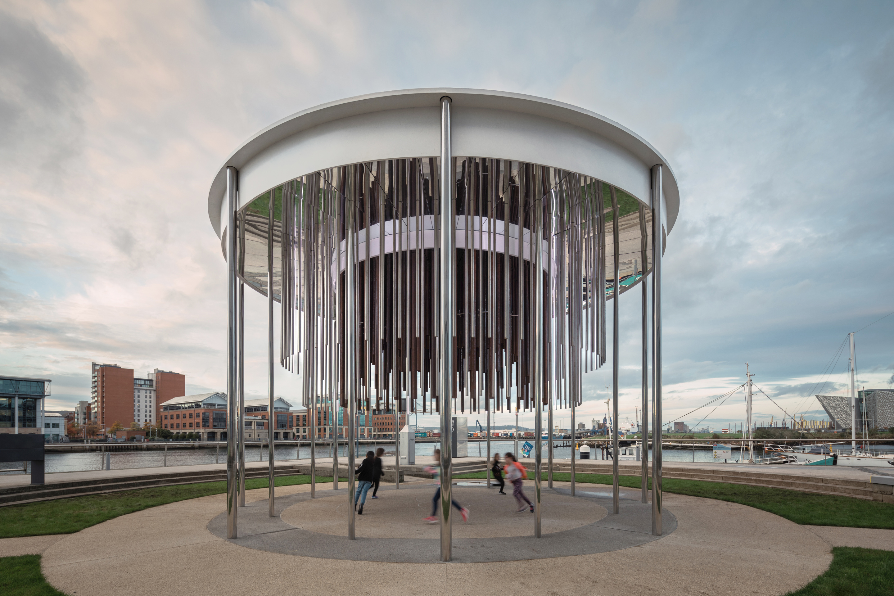 Inspiration was drawn from the industrial nostalgia of Belfast’s docklands, the vibrancy of a bygone era. It is located at the edge of the River Lagan in Belfast’s Titanic Quarter. The site offered an opportunity to connect the edges of the city, forming a visual and sonic interaction across the city’s river.
