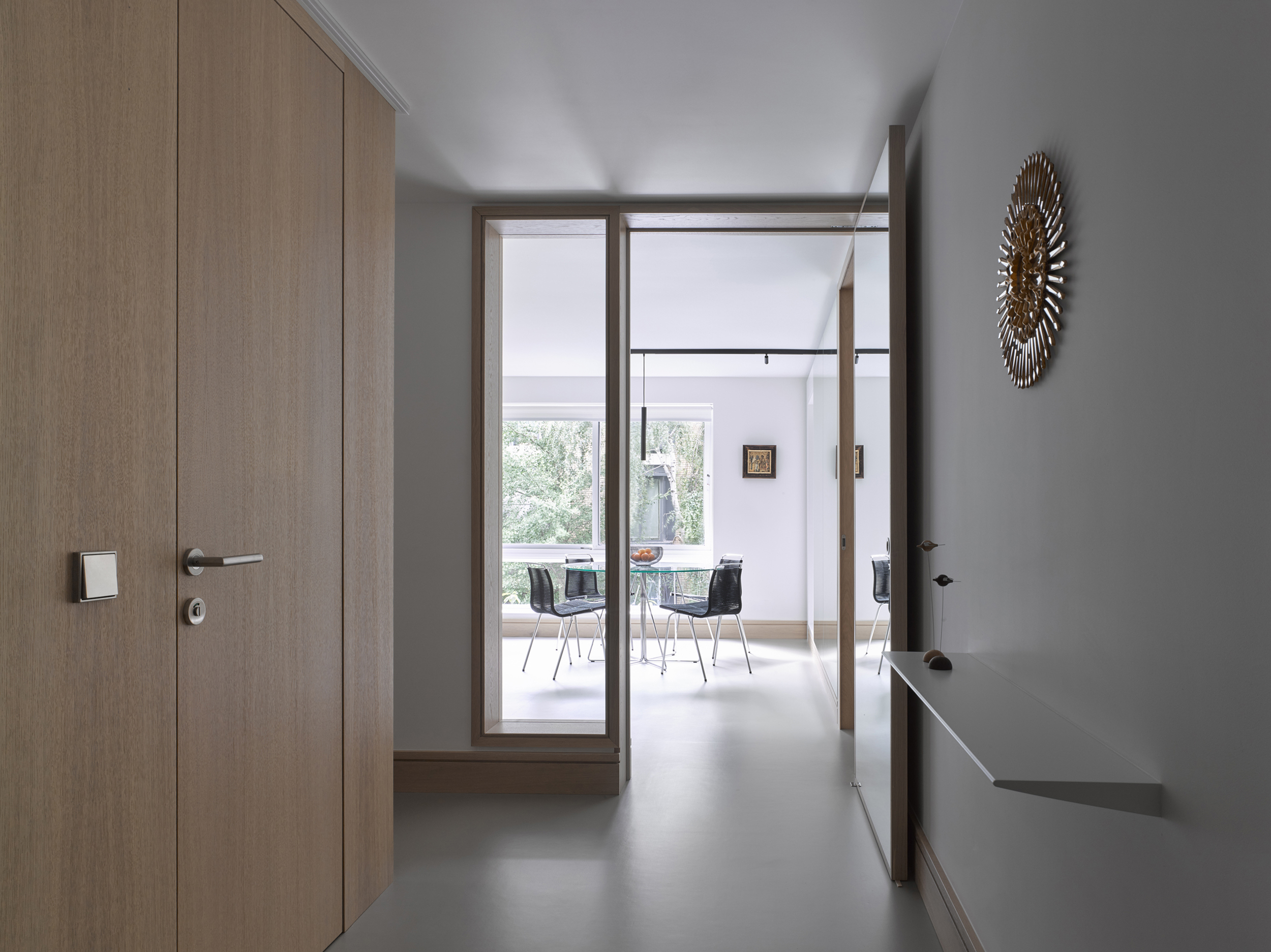The restricted palette of materials strives to provide continuity and unity throughout the flat, as well as an elegant simplicity that induces a feeling of serenity. Consequently, light oak is used for doors, panelling, skirting and bespoke furniture, khaki grey for linoleum flooring and kitchen cabinets, with crisp white surfaces for walls and ceilings for better reflection of light.