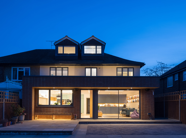 The new rear extension incorporates full-height glazing to engage with the garden and external brickwork, recognisable as similar to the existing building but also subtly differentiated from it using contrasting stack bonded bricks. A cantilevered overhang provides a degree of shelter and shade to the rear facade with a wood soffit mirroring interior wood cladding. A sedum roof and large rooflights allow further natural light into the extended space.