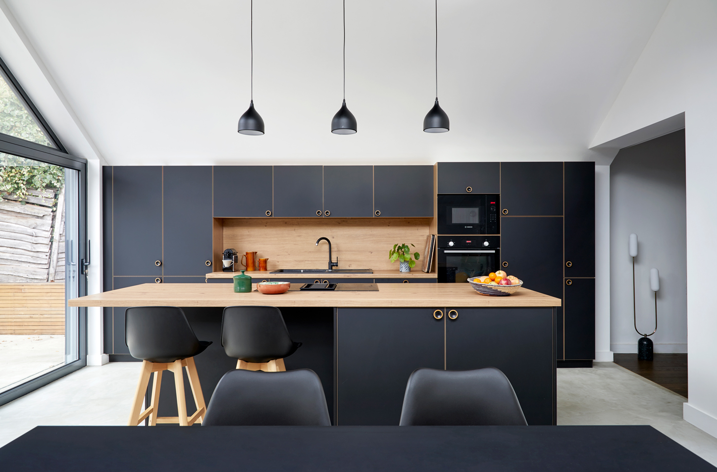 Lumin Architects has used a muted colour palette, with a kitchen finished in anthracite grey, navy blue, and wood, complementing the cement floor, creating contrast in space, playing with both minimal cool and warm natural tones.