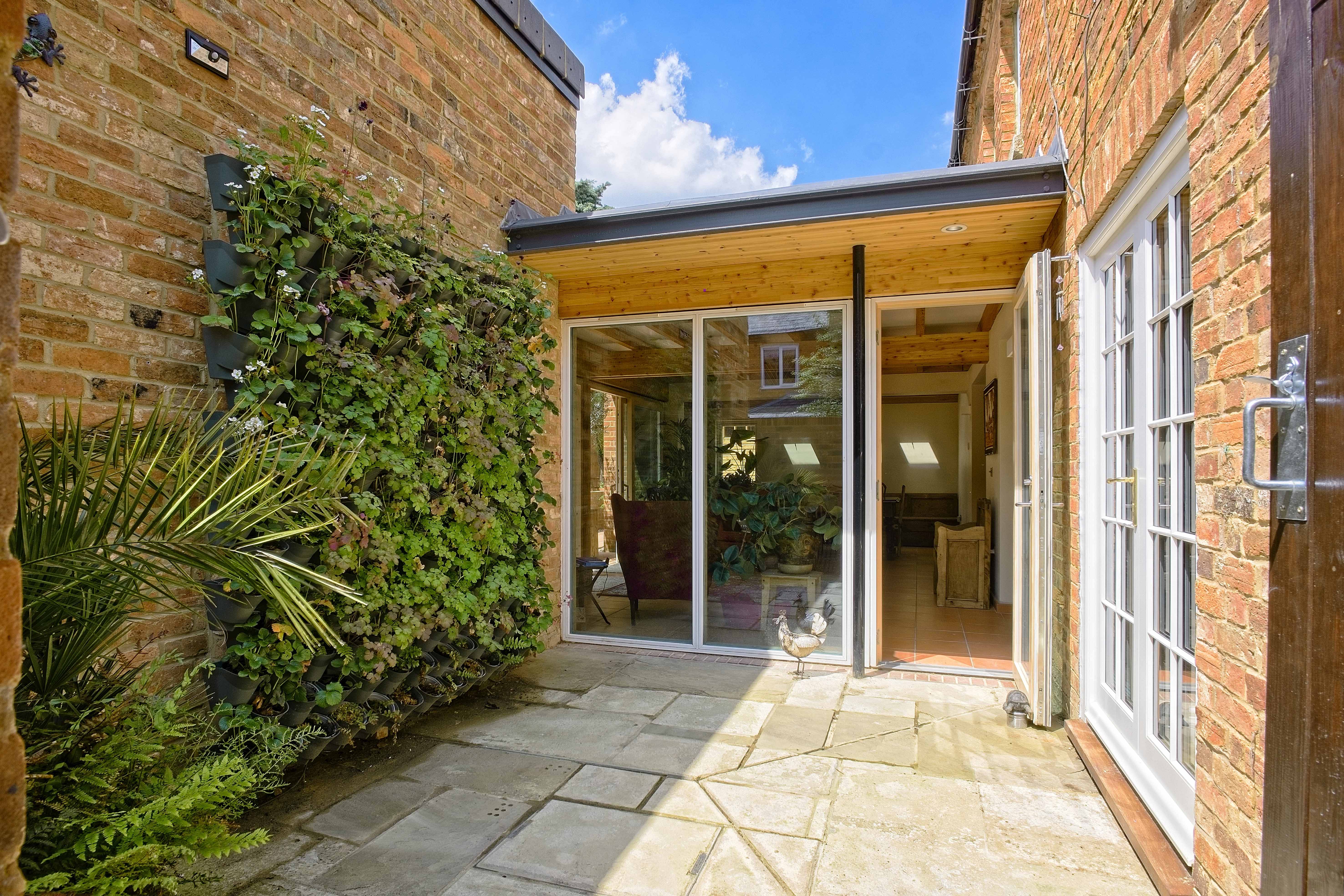 This site is located within the Yardley Gobion Conservation Area. The extensions are of two contrasting architectural forms. These being, firstly, the new monopitch roofed north wing. This leans against the existing north façade and extends westwards, forming a bookend for the new flat roofed garden room.