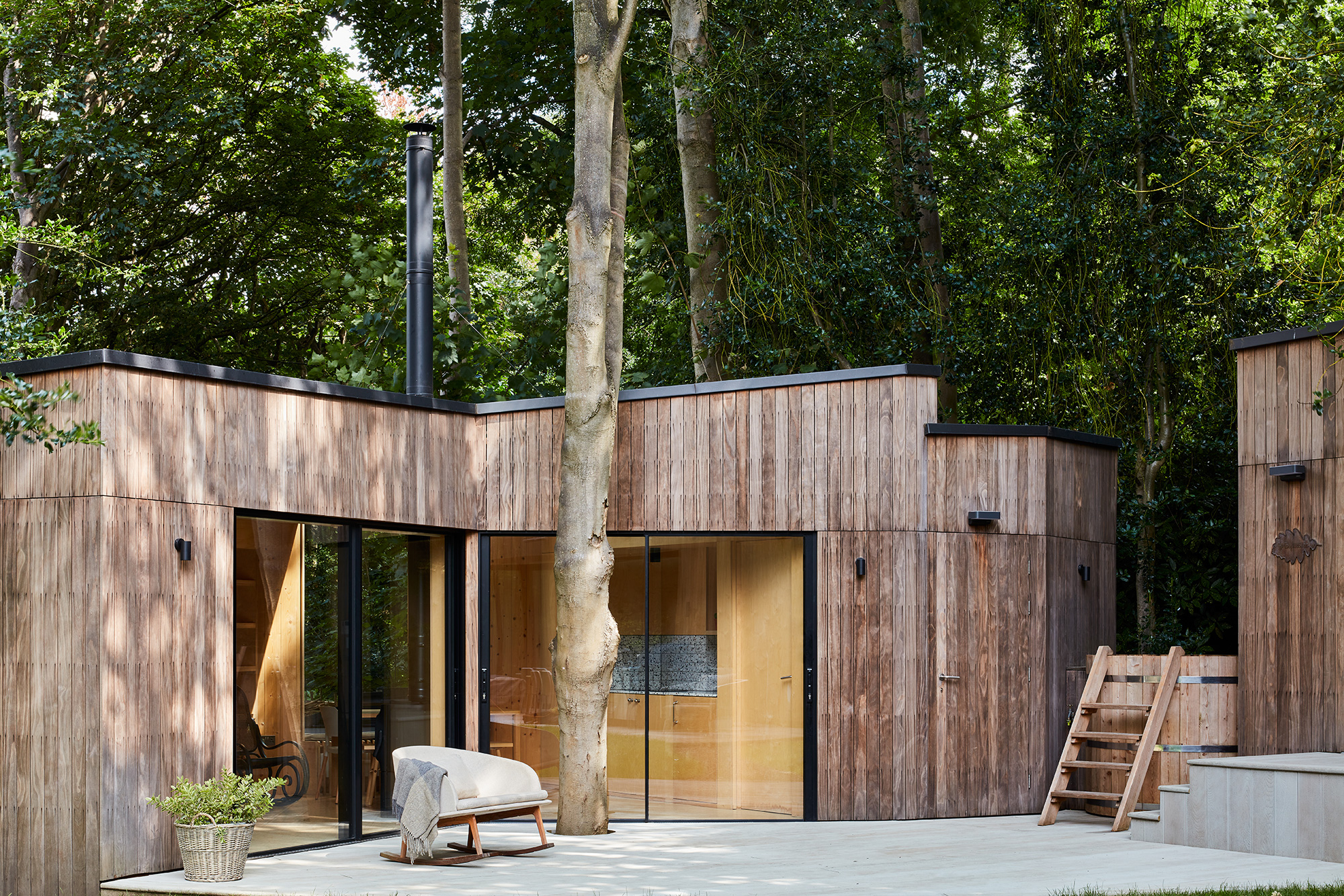 The scheme was designed by architect Cooke Fawcett in collaboration with interior designer Black and Milk. Set among mature trees, whose locations inform its angled geometry, the building is broken up into what appears as two volumes externally. This subtle fragmentation articulates the key components of the scheme: a flexible garden room, storage space and sauna.