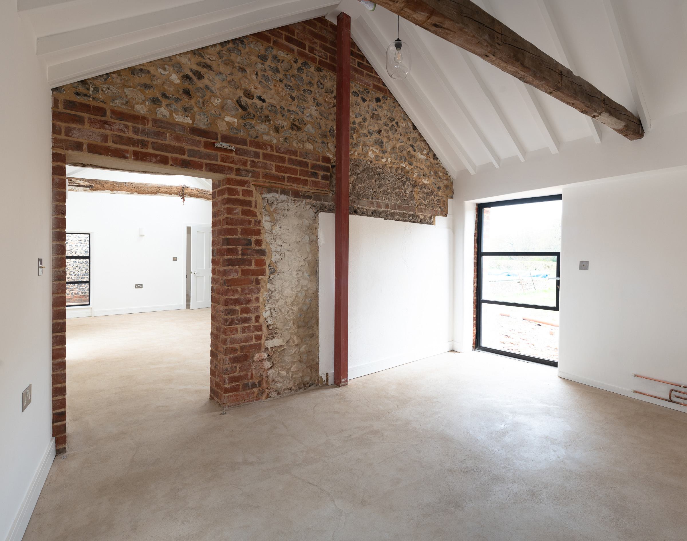 The extension to the home was created by reconstructing a derelict feeding shed adjacent to the original farm house. As this structure was listed, original features such as the feeding trough were reinstated in the new space and the original tree trunk beam kept in-situ. Contemporary detailing and conservation rooflights give the space a variety of textures and lots of light.
