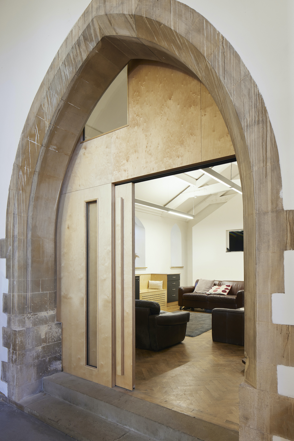 A beautiful birch ‘Sunday School’ door is located just off the nave, designed to offer privacy but with glazed cut-outs to echo the church’s belief of connectivity, letting the light out and accepting all.