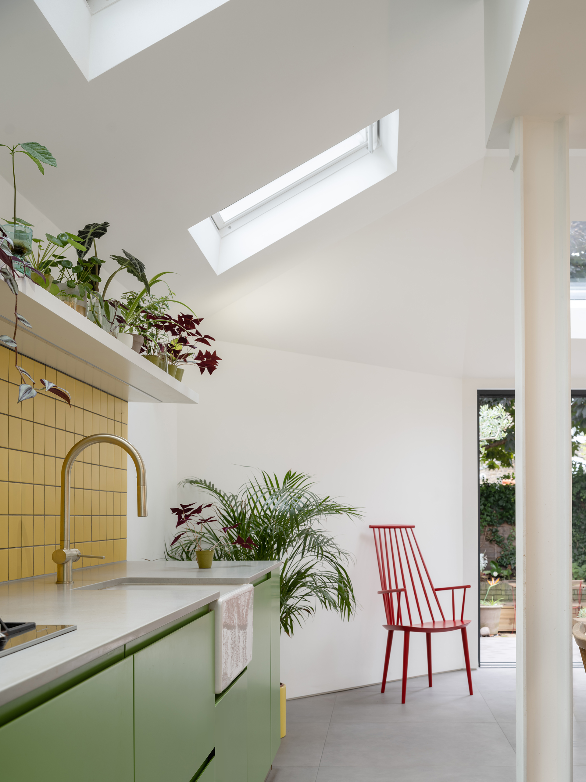The rear ground floor wrap-around extension uses the chamfered site boundary and planning restrictions on its height, to create what feels like a vaulted space for kitchen dining and play. Here rooflights are arranged for a quiet and secluded feeling, despite being tightly nestled between neighbours, while an integrated blind on the largest rooflight affords an incredible tranquility on sunny days.