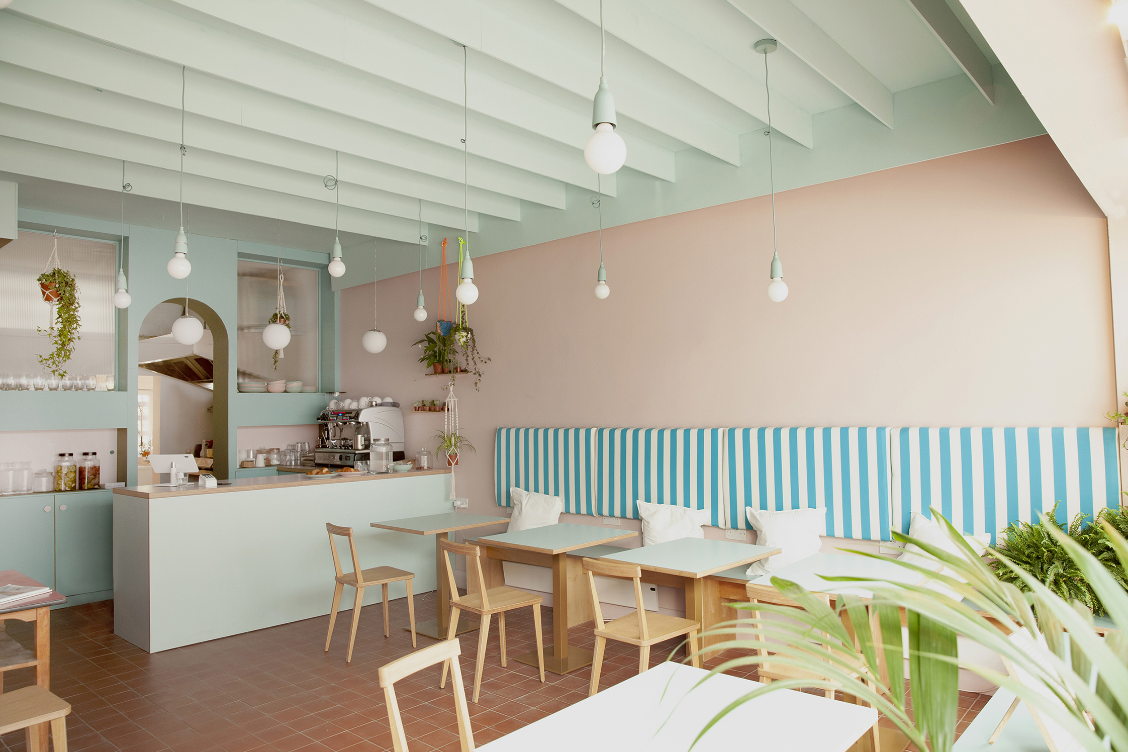 The arch is finished with rose and pistachio linoleum, a carbon-neutral durable material. Ribbed glass brings additional daylight into the kitchen, avoiding a dingy back workspace. This is paired with a rose, pistachio and mint-coloured counter and café seating, 70s salvaged sanitaryware and utilitarian quarry floor tiles, enabling future spatial transformations. Bright stripes, reminiscent of market stalls and fairgrounds are used for awnings and backrests.