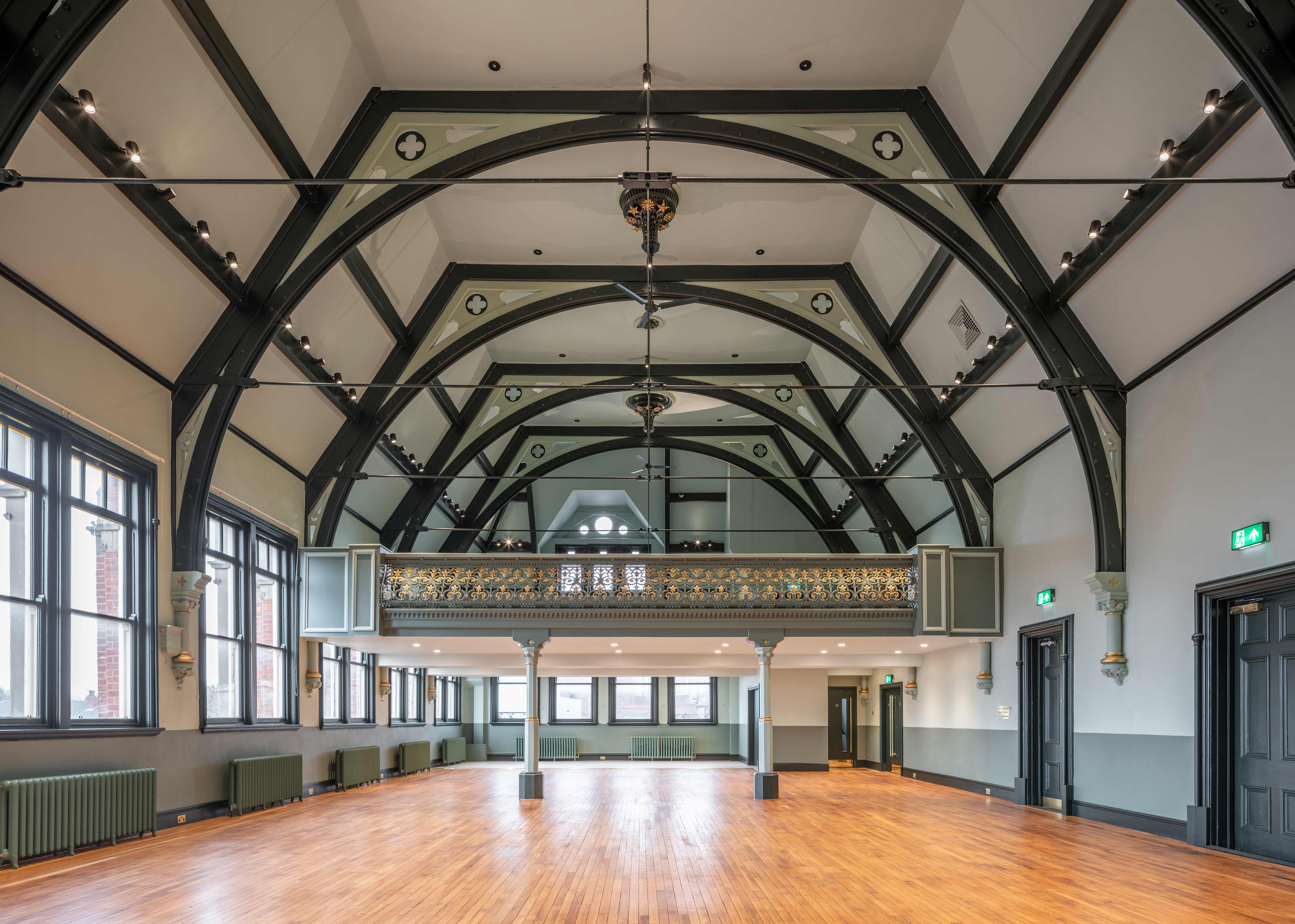 To open up the space, non-historic intrusive partitions have been removed and original openings and apertures reinstated throughout. Wherever possible, the ballroom’s historic features have been restored and celebrated. A new decorative scheme has been adopted which provides a contemporary take on a traditional Victorian colour scheme. This creates a dynamic yet approachable space that welcomes the diverse local community. A new lighting scheme has also been introduced which adds improved flexibility for a range of community uses.