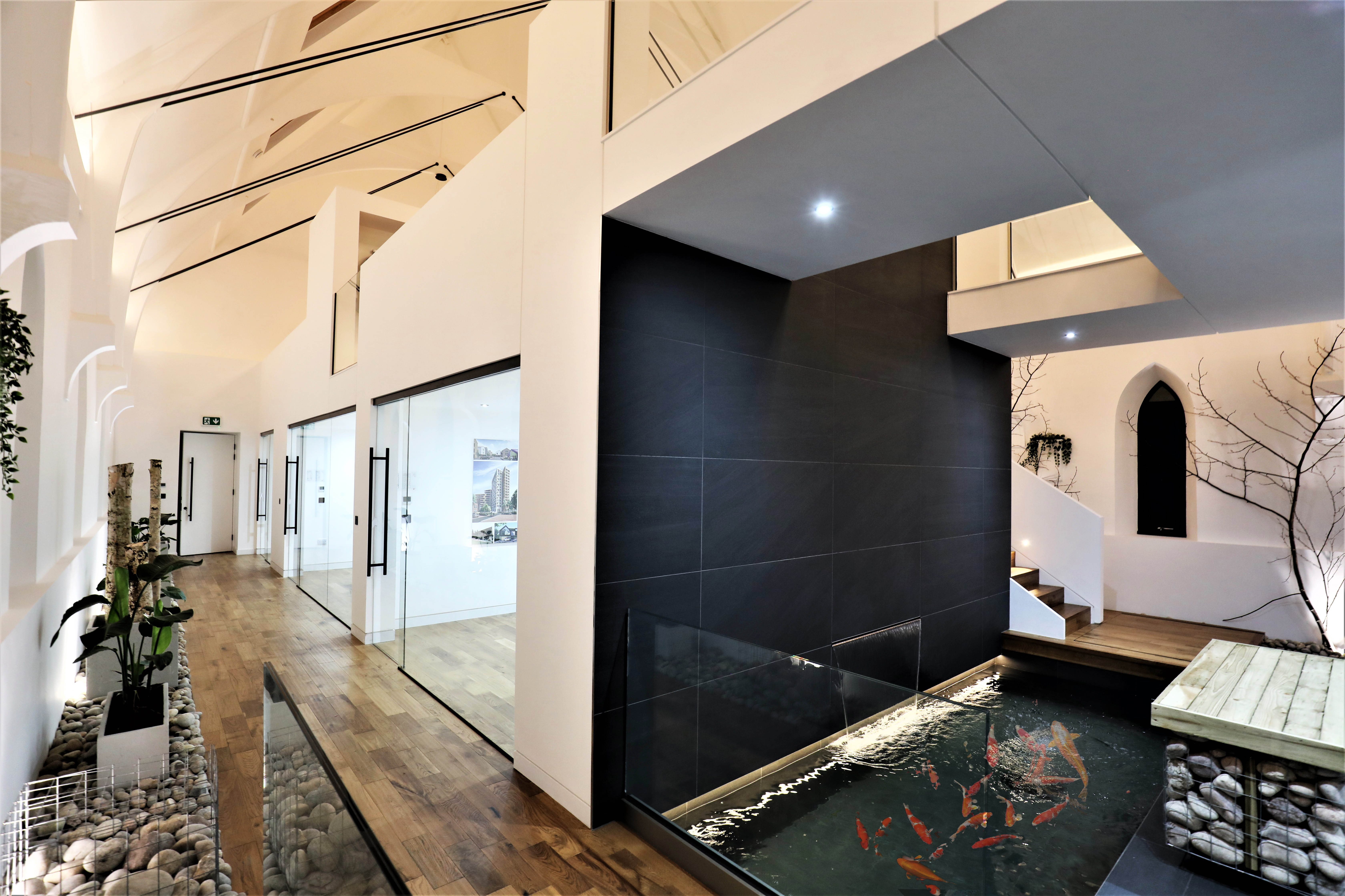 The pond dramatically reveals itself upon entry through the original church doors and sets the tone of what this place is about: a revealing sensory journey of discovery, a place in which to come, instil and enjoy creative working and future living.
