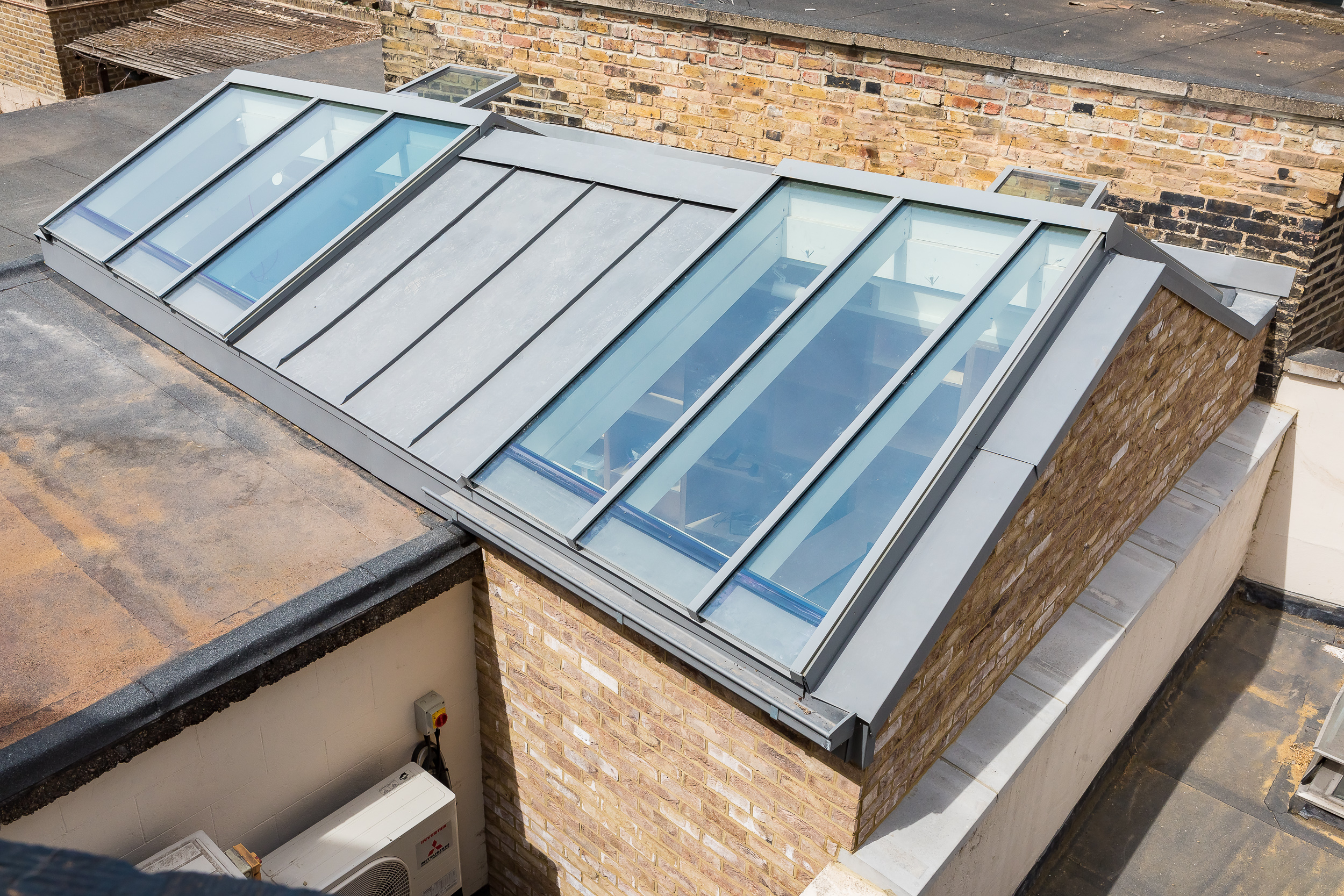 Site constraints highly influenced the design both from a structural and logistical point of view. Structurally, a light touch approach was developed by HF-K engineers to avoid the need for new footings, reducing unnecessary use of concrete, and allowing the structure to be built up on existing walls. New structural elements that create the mezzanine floor, double height space and stair well are celebrated. Exposed, red painted, PFC beams crisscross the space. Timber structural posts to the rear wall supporting the roof eaves and box gutter are similarly expressed allowing for storage between – essential on such a small site. The roof geometry was informed by the non-orthogonal footprint of the site and led to a sloping ridge beam adding a subtle dynamism to both the interior and to the urban roofscape externally. Surrounded on all sides by neighbouring buildings, the site can only be lit naturally from above. The double height space at one end allows light down into the ground floor. Privacy and overheating concerns had to be balanced with this. The roof was therefore only partially glazed. Logistically, difficult access to the site meant that with all materials and components were delivered and carried by hand through a small front door adjacent to the retail unit. The roof was therefore designed as a series of portable glazed and timber components. The result is secret and hidden, the roof the only element visible from the sky or the rear windows of the urban block that surrounds it.