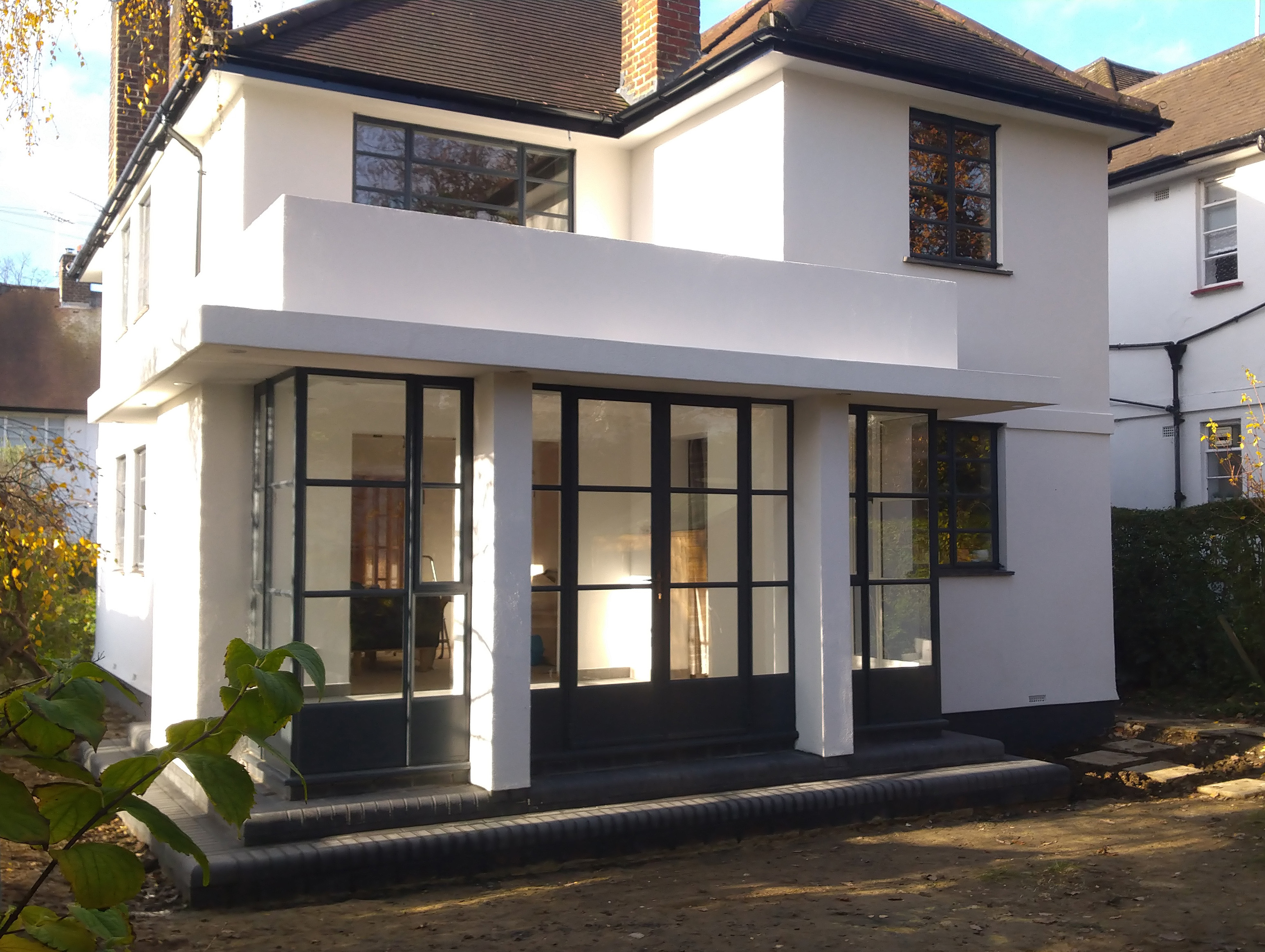 The consent however were renewed regularly and eventually the project was completed some twenty-two years later. The aim was to increase the amount of living space and its connection to the garden, and to provide light studio space. The original house was built in 1937 to the designs of noted Suburb architect CR Crickmer and is in the Hampstead Garden Suburb Conservation Area. AT the same time the decaying exterior rendering of the house was renewed and all the original single glazed steel windows were replaced to match with double-glazing. The context allowed he extension to be treated as a pavilion symmetrical about both axes and allowing windows to face in all directions. The projecting concrete canopy over the front entrance of the original house provided inspiration for a similar feature on the extension. With its three corner windows and the organisation of its structural rendered-brick piers some inspiration was taken from the contemporary work of Frank Lloyd Wright.