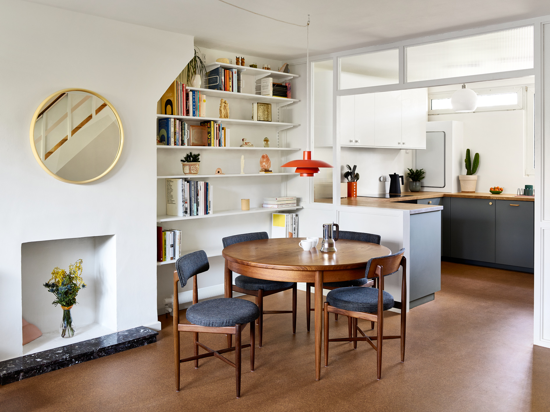 The design incisively drew out the maisonette's mid-century DNA, bringing light into garden-facing living spaces whilst working to a compact plan. The project's central challenge was to open up the apartment's tight organisation and highlight the virtues of its original features, all while resisting direct reproduction. The driving approach for Brownlow Road was to strengthen visual connections and circulation; release truncated space; and introduce new, congruous moments of design intrigue. A new reeded glass and timber partition formed a hybrid threshold, providing storage and maintaining visual connection between cooking and living zones. Freeing up the previously partitioned kitchen became a key design move, improving its connection with living and circulation spaces. The partition's glass and timber became part of a wider exercise in revisiting and selecting materials from a rich mid-century palette.