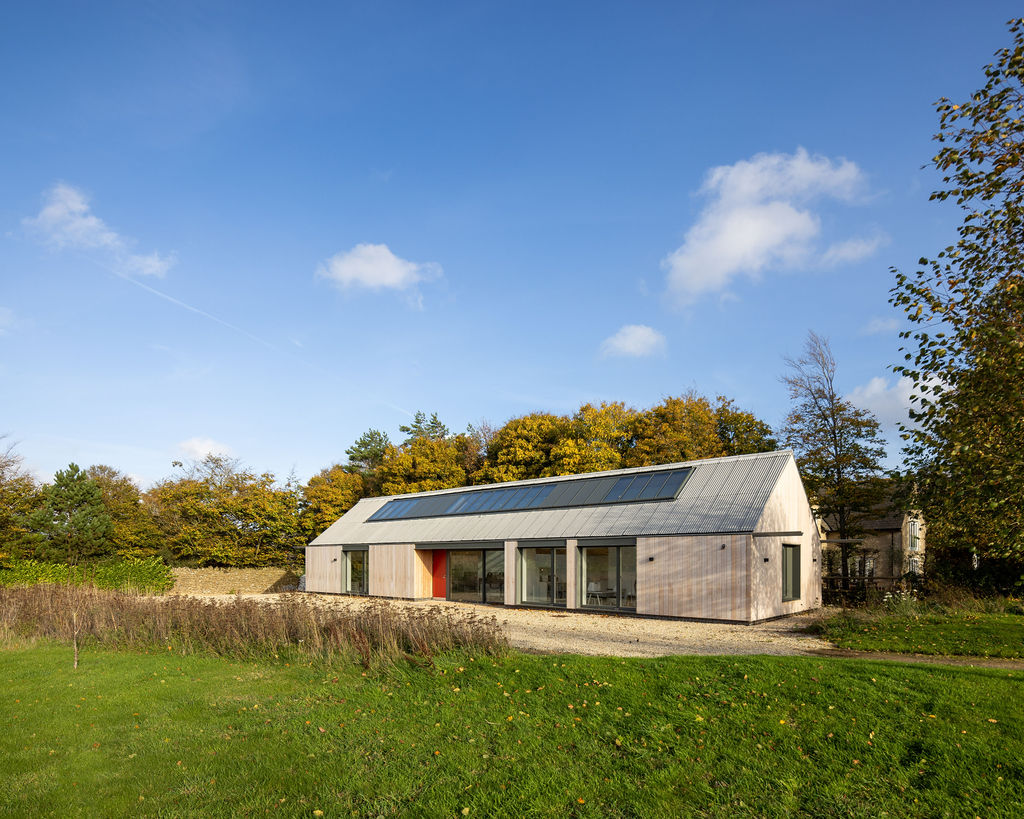 The Client is an artist and printmaker requiring a series of daylit spaces to carry out a variety of wet and dry processes ranging from design to sewing and etching / printing. The building typology adopted is clearly legible as a simple barn form, appropriate for the setting at the interface between the domestic gardens of the village and the open agricultural landscape. The form also works well for the studio use, with an abundance of controlled daylight from the roof, and inspirational views out over the meadow to the North-west. A single window in the South East facing gable picks out a more focussed view. The structure is a simple series of expressed portal frames made from LVL timber. The external materials palette continues with the aspiration of simplicity. A fibre cement roof on top of larch boarded walls speaks of simple vernacular barns, but with the careful detailing of a less agricultural finish. The glazing is a repetitive module, but with an enlarged section of glazing in the central bay – referencing the barn tradition of a large central opening. The entire superstructure is made from timber with wall U values of 0.14 W/sqmk. Internally the Client’s brief called for white surfaces, which is given some relief and a suggestion of materiality by the expressed portal frames. The main volume is semi divided by a series of smaller servant spaces hosting the WC, plant and kitchenette as well as a small fume cupboard room. The building is heated by an airsource heat pump and underfloor heating within the power floated.