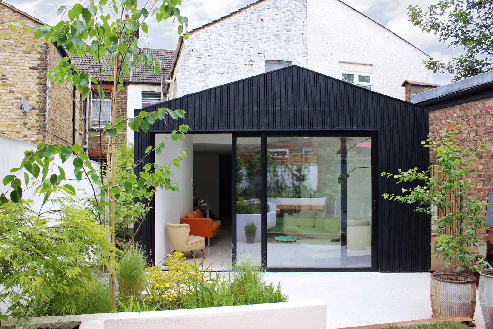 They wanted to extend, remodel and refurbish their property to enable them to maximise its potential and allow them to enjoy the garden space which was currently accessed via an old lean-to extension containing the bathroom, beyond the kitchen in the existing rear addition. They wanted something simple but non-standard and budget friendly and wanted a timber frame so much of the work could be self-built. A range of proposals were considered and the final scheme which has now been successfully implemented used a skewed plan form to maximise both space and light while integrating the new elements into a newly landscaped garden. The irregular plan was accentuated with a non-symmetrical roof pitch to provide further dynamism and interest to the overall form and elevations. A new garden studio building was created, using the same architectural language, providing a compact, multi-purpose art studio and guest bedroom with ensuite, further framing the retained garden area, positioned to ensure sunlight was maximised in the garden. The plan form of the main extension also created a ‘secret’ garden along the side of the house, accessed from the new dining area and rear bedroom. The interior of the property was remodelled to ensure the optimum internal layout, moving the kitchen, bathroom and living spaces around, with bespoke joinery installed throughout to maximise integrated storage. A restrained palette of simple, robust materials was used, featuring black stained battens to the exterior, with polished concrete flooring, continued externally, plaster to walls and birch faced ply for the kitchen and built in furniture, providing an elegant contemporary space both inside and out.