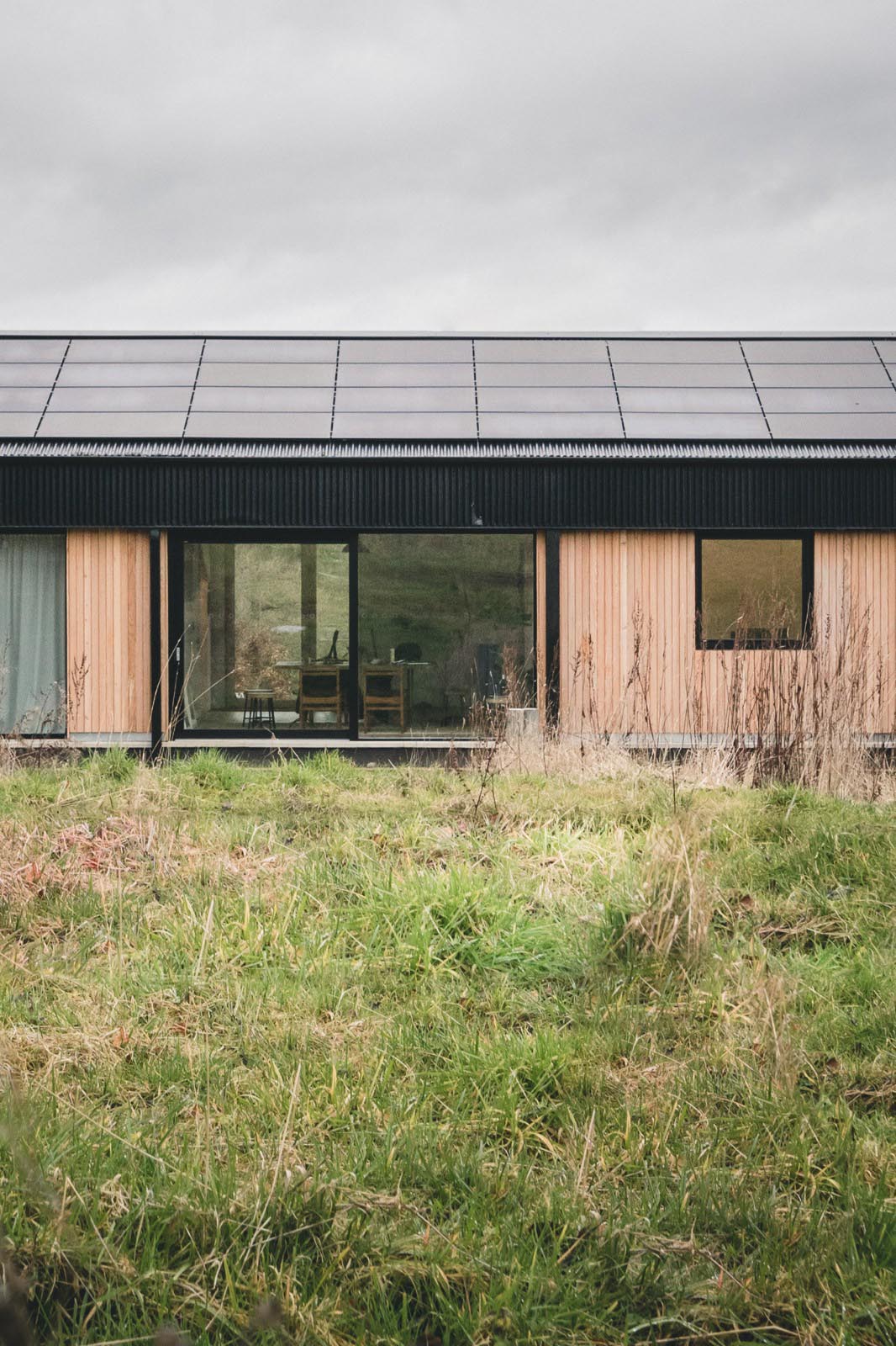 It attempts to address some of the key challenges facing architecture today: affordability, bio-diversity and both in-use and embodied energy. Starting life as an equestrian barn, the existing steel frame, structural slab, foundations and concrete yard were retained to minimise embodied energy. The slab was insulated with 250mm insulation, which was laid specifically for re-use. A pre-cut, labelled 300mm timber I-beam structure was erected over 5 days within the existing steel frame. The internal timber frame was then boarded, taped and blown with wood fibre insulation, triple glazed units installed and the original metal frame re-clad using black corrugated metal and larch with re-purposed industrial walkways as solar shading. The building functions as Charlie Luxton Design’s studio and a music recording studio. The interiors were fitted-out using UK grown Elm flooring, reclaimed timber windows as screens, recycled dry lining, low VOC paints and secondhand furniture. The overall low energy approach is augmented with a 20kW PV array, which meant that the building exported 2.5MWh more than it used in 2022. Heating is provided by a small ASHP through the MVHR system which also monitors CO2 to ensure high air quality. The building achieved exceptional airtightness of 0.3ACH @ 50Pa and has an as-built SAP of-24.6KgCO2/m2. The surrounding 3 acre site has been planted with over 700 native trees, shrubs and over 2,000m2 of wild flower meadow to absorb carbon emitted during construction and to create a habitat rich, beautiful environment. The project was managed by Charlie and Kate Luxton as the main contractor, with subcontractors undertaking the different packages of work. In this way cost and overheads for the project were minimised with a total cost including; PV, Landscaping, fit-out and services connections of £340,000.