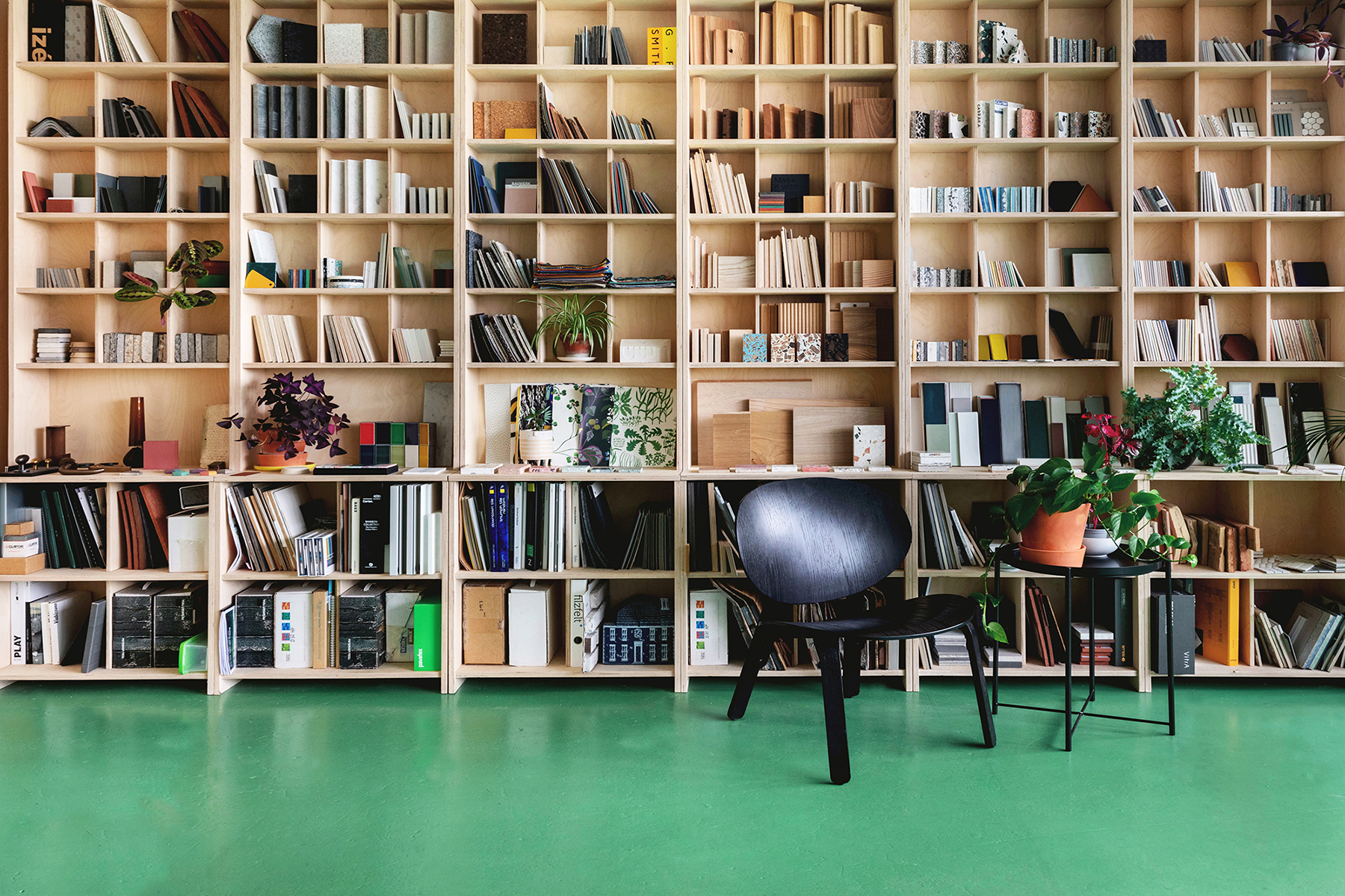 Achieving an impactful design at a low cost, this light-touch project repurposes a long-lasting, but carbon intensive, brick and concrete structure into a shared studio for small design practices. The project directly addresses the situation faced by many creative industry workers, where workspace is often rented with little freedom to make changes and limited tenancy security. The key innovation is that the space has been designed so that no alterations to the fabric of the existing building have been necessary. This model could be easily adapted for other locations – providing high quality and attractive spaces in previously under-used buildings. The scheme was delivered within just two weeks and for a very tight budget. A limited number of thoughtfully designed components pull the space together, creating a calm yet colourful studio that makes the most of it its 62m2 interior. Throughout, minimal interventions achieve maximum impact, from the simply painted walls and floors to a heavyweight curtain that divides spaces. A large open plan workspace sits alongside flexible areas for making, research and collaborative working. The standout feature is a family of specially designed modular CNC birch plywood storage elements. Used across the studio for bookcases and also an extensive sample library, the furniture is designed to be slotted together so that it can be reconfigured or adapted as the needs of the users change. The sample library, which also serves as a room divider, has slits cut into the shelves to make an interlocking design that creates a hierarchy between framing, horizontal and vertical elements, bringing a rhythm to the whole and allowing visiting clients to experience first-hand the materials that will be used for their projects.