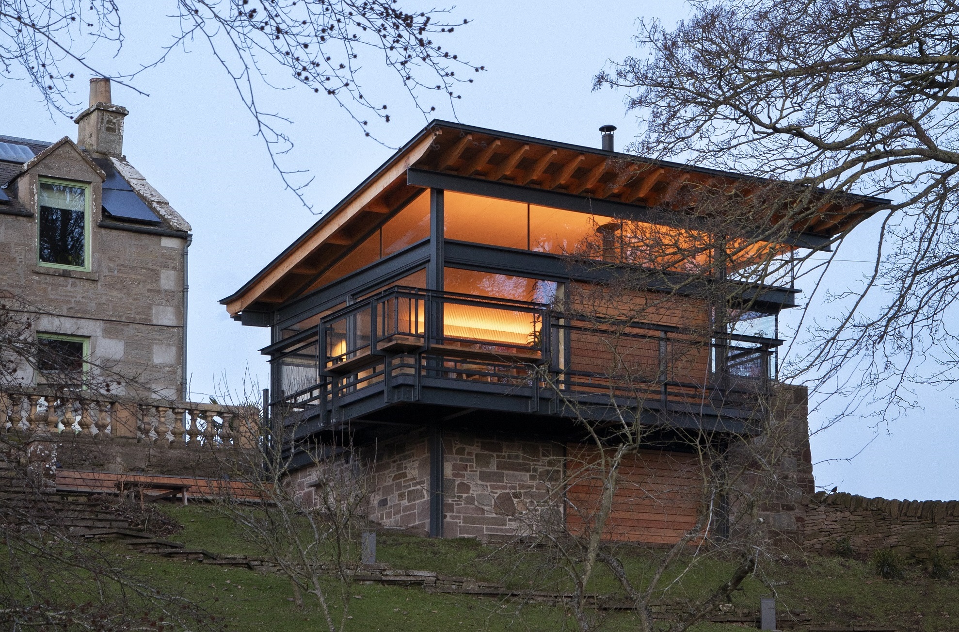 “To live life outdoors, sheltered from the wind” was the condensed brief to maximise a family’s enjoyment of their sloping, exposed, south facing garden, from dawn until midnight. An existing, partially ruined, dry stone boundary wall has been built up to form a robust stone plinth, containing a workshop and store, on which is perched a steel and glass living space, framing elevated views over Rescobie Loch to the south east and the well-tended garden to the west. A monopitch roof brings shifting light into the depth of the plan throughout the day via a band of clerestory glazing. Sliding planes of glass and timber open up the building to the surrounding tree canopy and countryside. A broad wrap-around balcony cantilevers over the garden, designed for socialising with integral dining shelf, drinks recess and suspended corner seat, placed to enjoy the last rays of evening sun. At night the family and friends can retreat indoors around a log burning stove, complemented by the subdued glow of warm lighting concealed within the birch plywood shelf lined interior. Materially, stone recovered from the site was mixed with new local Forfar stone to build the solid base. Larch cladding faces the upper walls and an external steel frame cradles the insulated timber box of the living space. Steel structure was selected for its long spans and ability to cantilever. Sufficient solar gain is generated through the large areas of glazing to provide a good ambient daytime temperature even in winter, while the deep roof overhang prevents overheating in summer. The clients appointed the architect two months after he started his own practice and this constitutes his first completed building. It demonstrates an interest in the method of construction.