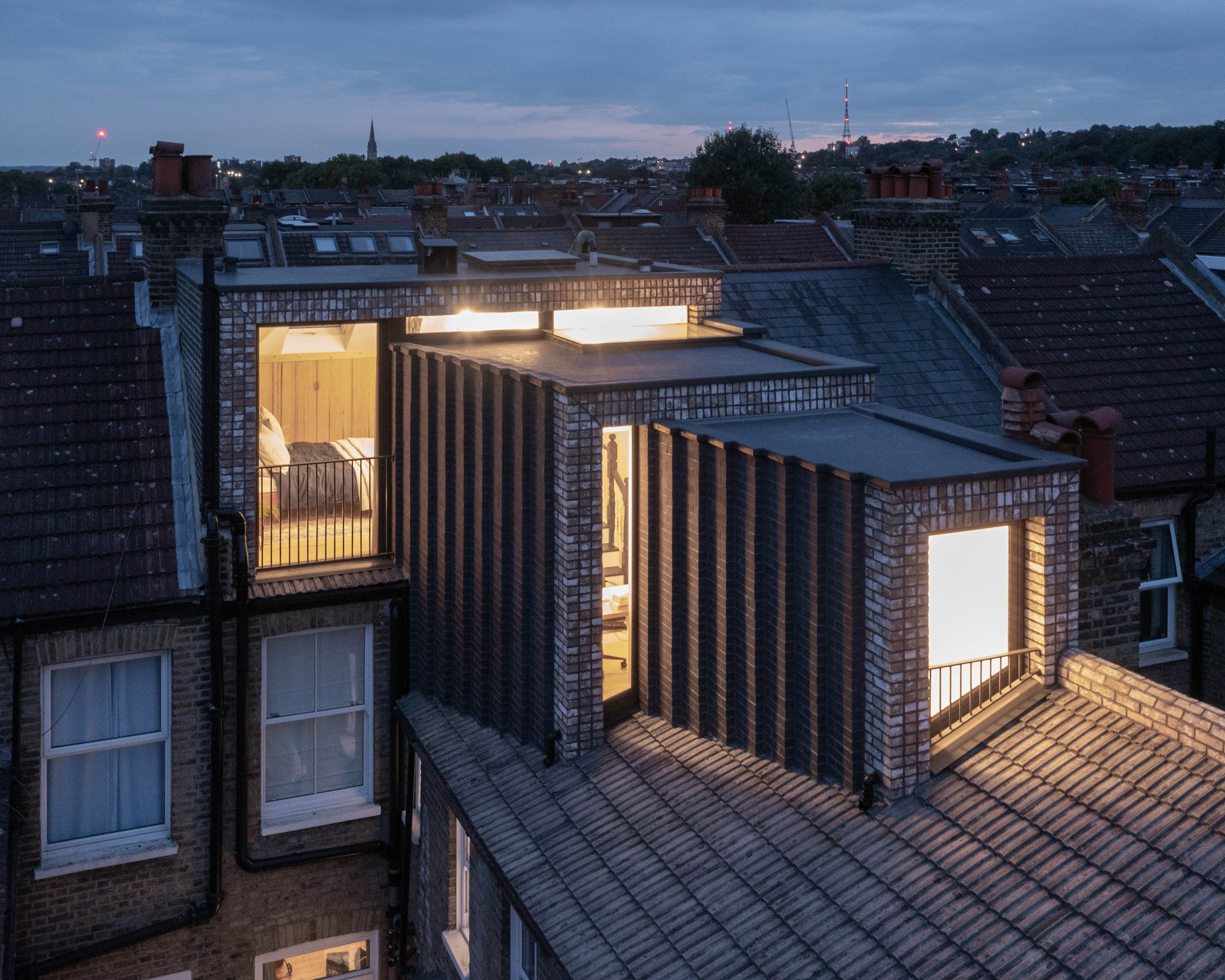Stepped Loft makes the case for the loft as the crown of a home, standing proud in the roofscape of southeast London above a Victorian terraced house, expressed as a series of stepped brick volumes hosting a new study, bedroom and bathroom. The brief emerged out of two significant post-lockdown changes for a family that was outgrowing their home: the arrival of another child and a permanent shift to working remotely. The massing follows the house’s original L-shape, but breaks down an otherwise imposing volume with brick frames that scale down in increments, pulling out of each other like a telescope, whilst creating apertures for light-filled rooms. The interiors feature natural materials, with exposed timber rafters and exposed original brick, celebrating the stepping brickwork of the chimney stacks to reinforce a relationship between inside and outside, between old and new. Loft extensions in the UK traditionally feature roof tiles on their sides, to blend with the existing roofs. In Stepped Loft we wanted to assert this new level's presence in a more contemporary way, whilst still being sympathetic to the colours and materials of the existing house. The natural choice was to use brick, choosing two colours, dark grey, to blend with the retained concrete pantiles, and a lighter London stock brick to complement the existing brickwork. Following the same stepping logic, the brick cheeks articulate a rich texture that cast shadows by day and softly glow at night. With its confident nested portals and stepped brick cheeks, this design affirms a loft can be characterful and unique whilst being respectful of its neighbourhood context and original building fabric.