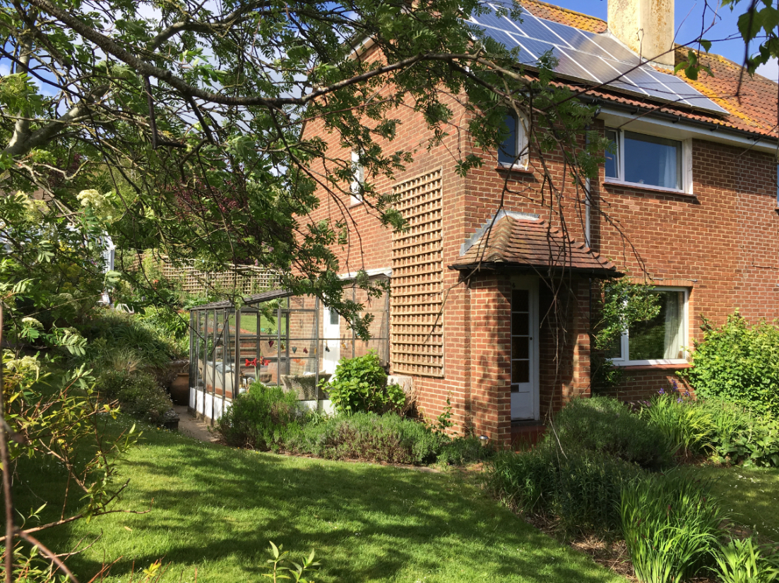 Green-fingered Amanda and Stephen make the most of it by growing fruits and vegetables, to the point of being almost self-sufficient. They also used to enjoy the garden from their much-loved aluminium-built conservatory. But with new additions to their family, they needed more space to entertain, whilst remaining at the heart of the greenery. Extending at the side of the house was an obvious move. But what drove every design decision was the desire to retain the spirit of the old conservatory: its elegant dark slim frames, its views of the trees and hedges, and its close relationship with the surrounding grasses and flowers. Amanda and Stephen were keen on quirkiness and unusual shapes, so several card models were developed to explore options within the confines of local planning rules. The solution was to build an asymmetric double-height space: openings frame specific views out, whilst preserving privacy. Pivotal to the design is the ribbon window which places the viewer at the height of the flower bed, giving the sense that the vegetation is inside the room. A limited palette of materials was chosen to play down the visual impact of the build: Staffordshire Blue clay tiles drape over roof slopes and facades, slim black aluminium windows recede within the cladding, and grey floor tiles contrast with the bright interior. A flint plinth anchors the volume down and harks back to the self built flint garden wall that once encircled the conservatory. It is also a nod to the surrounding chalky South Downs National Park. The property was already equipped with solar panels and water butts. With the highly insulated timber framed extension, underfloor heating and productive garden, the family now has an even lighter environmental footprint.