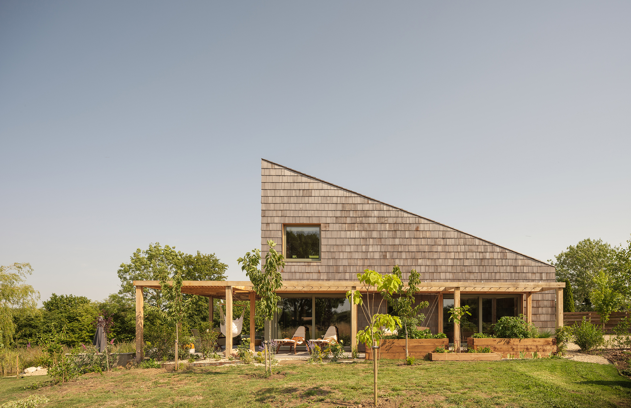 Delightful setting. Proposals required to help ‘outdoorsy’ clients engage with garden and countryside. Context demanded low-profile and sympathetic, while clients aspired for drama and excitement when viewed externally and internal volumes. Brief and context suggested passively designed property. Clients recognised ‘Passivhaus’, feared it for it’s perceived high cost and added complications. Passivhaus ‘5 pillars’ discussed briefly concept design meetings, guiding rationalisation of the form, supported strategic decisions around glazing extents and positions, inspired ownership of the construction process to deliver high-quality product. Simple ‘wedge-like’ form delivers sense of stealth and privacy on the approach, facing neighbouring properties. Lowprofile creates compression when entering the property, rising away as you enter the vaulted open-plan spaces. Once inside, interconnected volumes are presented: vaulted kitchen; staircase with rooflight over drawing the eye upwards; picture-frame window to the new pond; sliding and corner glazing to the living area providing almost panoramic views. Restrained building form simplified construction process, reducing complication, labour and material wastage, while enabling excellent levels of air tightness to be achieved (1.0ach/hr). Prefabricated timber panel package (above slab/plinth) supplied with all cavity-fill mineral wool insulation (300mm), internal air tightness membranes and tapes / sealants, plus external breather membranes. Prefabrication accelerated construction, reduced site waste, supported excellent air tightness. Western red cedar shingles selected for all walls and roof coverings for cost, simplicity for self-builders, and reduced the embodied carbon. Material creates subtle but striking object in the landscape, silvering beautifully. Original budget of £300k. Eventual spend £350k. Increased insulation levels, triple glazing, air tightness aspirations, the inclusion of an MVHR, all agreed during early fabric-first conversations. Total energy consumption in use 44kWh/m2/yr.