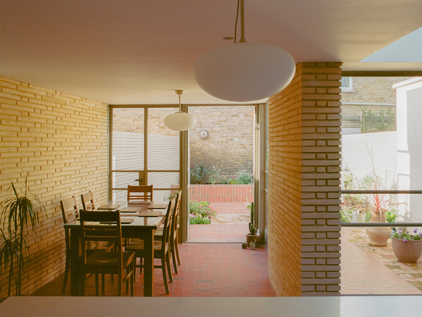 Dating from 1864 and built of yellow stock bricks, the house has been owned by the same family for over twenty years. They wanted to create a communal kitchen and dining space that interacted with the garden. The palette of the extension’s stepped façade subtly references the original house. Formed of yellow Petersen bricks and punctuated by pale green steel-framed windows, it folds around the garden, bringing light into the centre of the kitchen and allowing a sense of space and connection with the outdoors. With a large skylight running its full length, the kitchen is at the centre of the space. The dining area projects into the garden, wrapped on two sides with expansive glazing, the scale of which is softened with smaller panes of glass and crafted detailing. In keeping with Pensaer’s focus on craft and bespoke detail, the design uses high-quality, hand-made materials which lend the space character and atmosphere. Together with the careful consideration of light and aspect, this has created a comforting, welcoming space. Terracotta floor tiles, both inside and out, reference the history of the house, and the addition of reclaimed Victorian floor tiles in the landscaping forms a further link to the original house. The winding path through the garden draws the eye out from the house, adding depth to a modest garden.