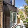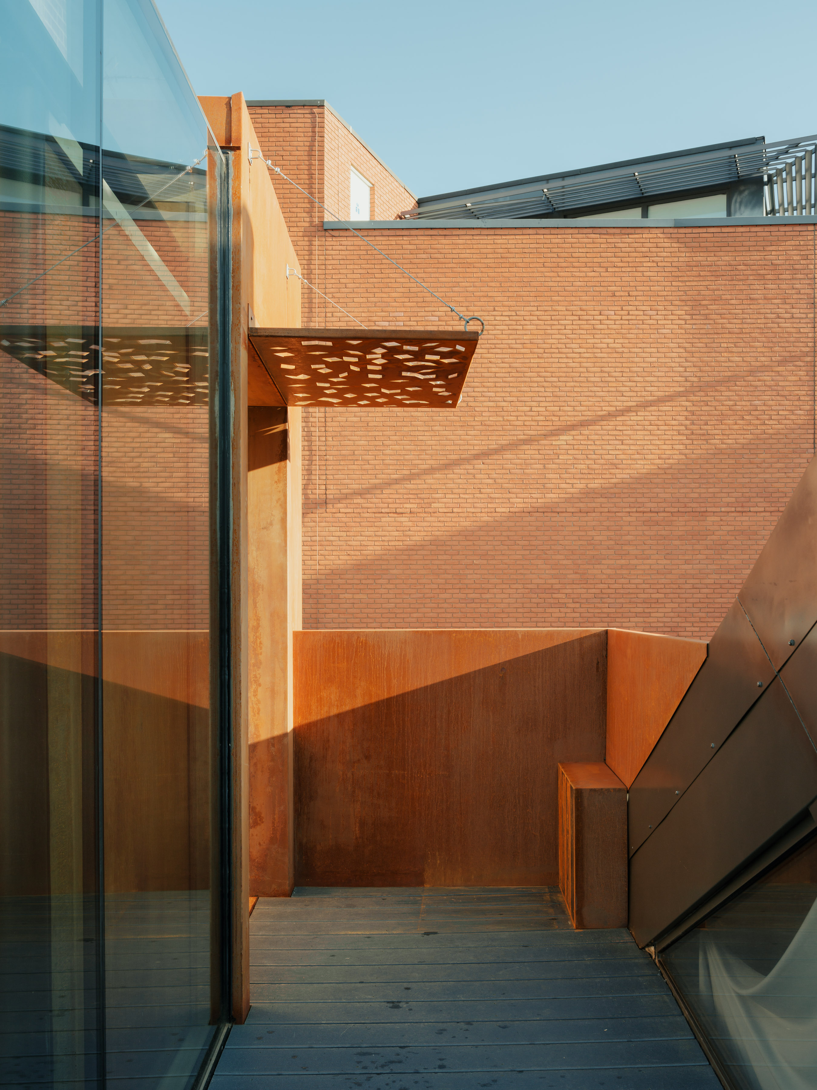This development of an existing residence in a Victorian warehouse incorporated the complete remodelling of the roof terrace, installing an exposed Siberian larch glulam structural frame, plywood, corten steel and glass panels. The warm tones of the weathered corten steel rhymes well with both the surrounding brickwork, and conceptually with the robust manufacturing and warehousing history of the location - Faulkner's Alley in Farringdon. A glulam portal frame (pitched at 3 degrees to match the roof of the glass box) was selected as this is a renewable, low carbon footprint structural solution. The timber grain and tone of the larch, and the invisibly-fixed plywood wall panels, gives a pleasing contrast to the corten and frameless glazing. A steel frame supports the large sliding door, independent from the glulam portal frame both structurally and visually. Slate-grey Ecodek composite boarding was used for the terrace decking. High levels of thermal insulation are installed in the solid walls and roof, with argon-filled double-glazing. Summer heating is moderated with solar control coated glazing and an opening rooflight for stack-effect cooling. Ergonomic oak handrails and a recessed corten handle are used for the stair and sliding door. Inspiration for the folded and sliding interlocking planes of corten and glazing was taken from the 1950's mild steel sculptures by Catalan artist Jorge Oteiza. The design of the laser cut-out pattern in the glazed corten canopy above the sliding door is a randomised selection of a Penrose aperiodic tiling. The resultant shadows cast on the corten and plywood recall the dappled light though trees in a forest.
