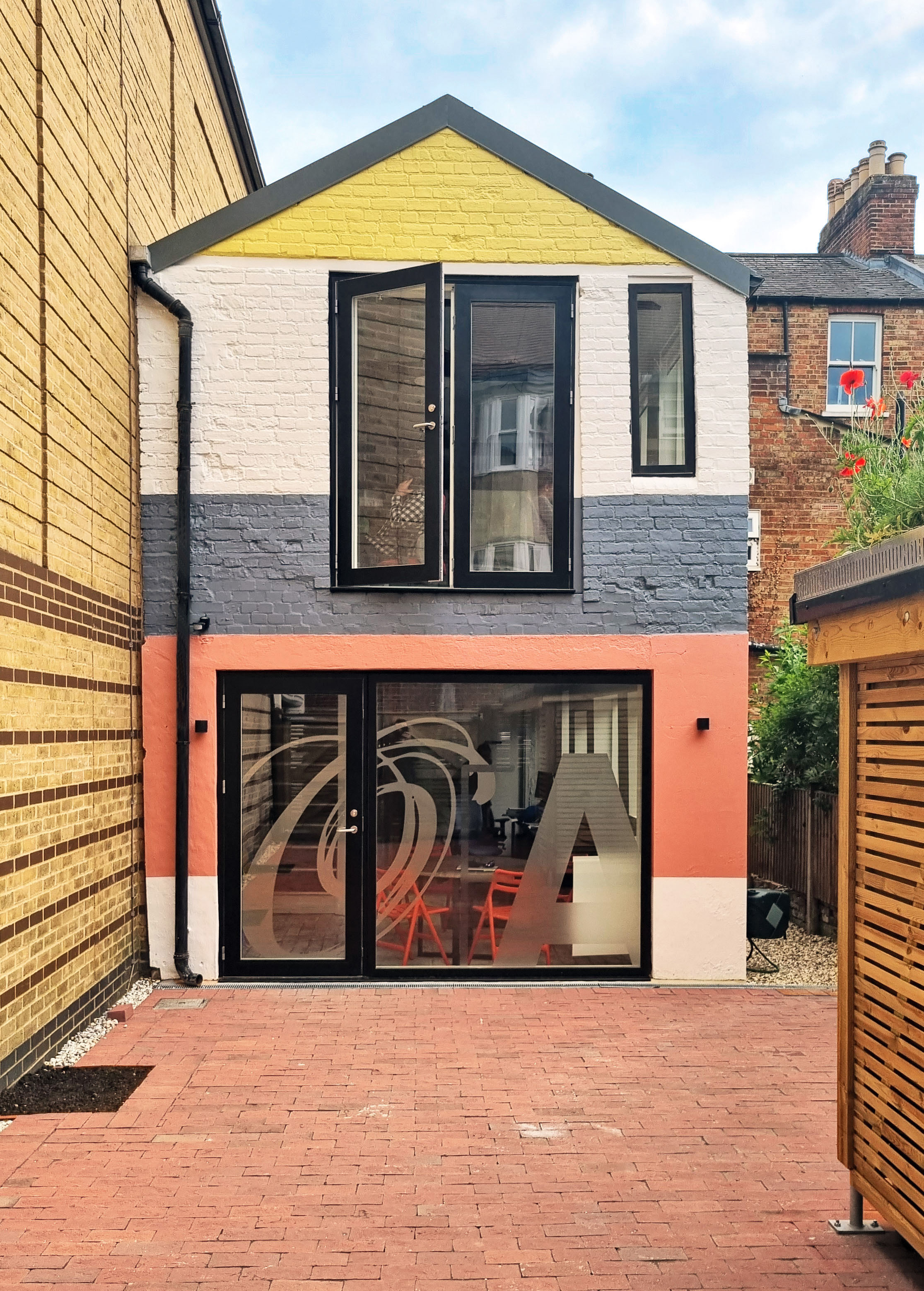 The building, formerly empty and disused, is now a vibrant and lively workspace and makes a positive contribution to the public realm whilst retaining the language and materials of its industrial past. The two-storey single skin brick warehouse building was formerly the store to the Annie Sloan paint shop at no. 33 Cowley Road. The precise age of the building is unclear however it is likely to be Victorian and shows characteristics of being a service building for light industry or commercial use. Large rear doors to both levels suggest access was needed for goods. The size and scale of the building suggests it supported other activities as an outbuilding or store. Historically the immediate area was associated with motor cars with a former garage sited on the adjacent St Edmund Hall student accommodation now the William R Miller building complex, so it is likely that for the early part of the 20th Century the building was associated with motor cars. It is owned by The Charity of Thomas Dawson who were looking for a new use for the building when it became empty. Original Field was approached to look at the feasibility of separating it from the front shop and converting it into office space and developed the brief and specification with the charity with a view to taking on the building as their new studio. The project involved substantial upgrades of the thermal envelope along with overall refurbishment and landscape.