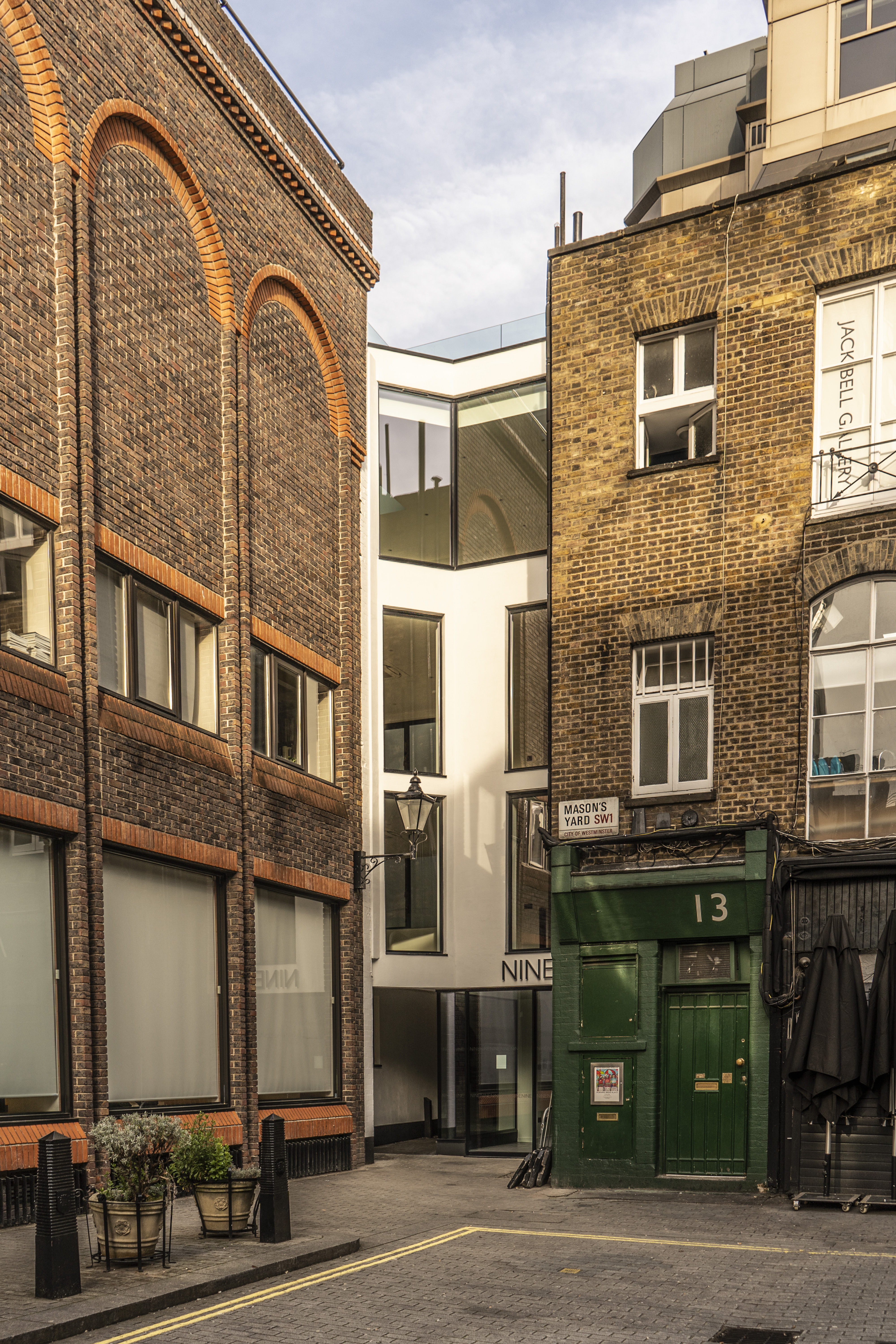 Notably, the building was once the studio of renowned British photographer Gered Mankowit, where he took the most famous portrait of Jimi Hendrix ‘‘Classic Jimi’ in 1967. The project included converting a dilapidated garage into an attractive new main entrance and reception with a staircase to offices above. The new glass-to-glass corner provides an active frontage, light, visual connections and natural surveillance to both Mason’s Yard and the public alleyway running through the site. The alleyway was visually opened up by removing the existing wall on the garage side and supporting the floors above on a slender column. To create clear, functional, flexible and accessible office spaces, most internal walls were removed and the floor plates extended with a timber framed wing for washrooms, storage and services. Necessary compartmentation was achieved with full-height glazed walls, allowing long views and natural light throughout. To maximise light reaching into the plan of this tight corner site Greenaway Architecture took the existing short openings down to floor level and specified the slimmest window frames, as well as introducing large structural glass skylights. The flat roof was converted into a generous terrace with access via a bespoke full width sliding rooflight and new staircase. Bright-white finishes throughout maximise light, offset by crisp black details. The historic party wall was exposed internally on each floor to reveal warm red brick and provide rich texture. Greenaway Architecture designed bespoke ‘NINE’ typography for signage and manifestation. The works significantly enhanced efficiency through addition insulation, replacement windows and upgraded heating. The removal of the garage reflects a move away car use and the introduction of staff shower/changing facilities promotes cycling.