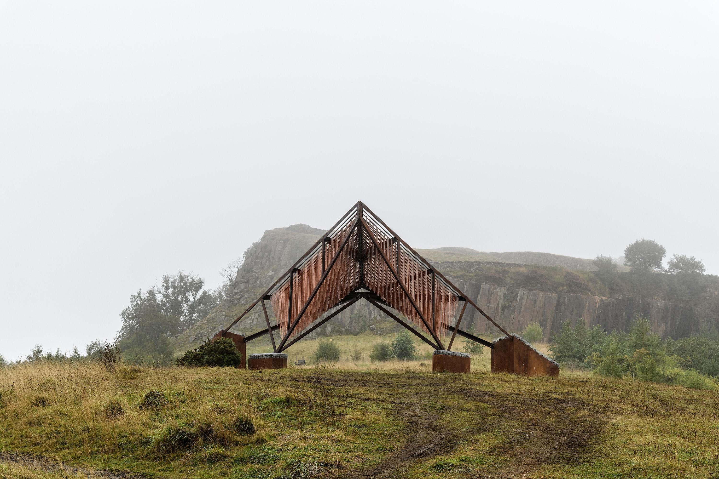 The piece is formed from 1900 copper chimes, creating an evolving soundscape to celebrate the Hadrian’s Wall Festival and 1900 years of this incredible UNESCO World Heritage Site. Made in collaboration with artist Ed Carter and academic / architect Tony Broomhead, the work highlights a visual fissure in the landscape – a missing section of Hadrian’s Wall, which was lost during the whinstone quarrying that continued until the 1970s. Inspired by the role of Hadrian’s Wall as a cultural meeting point, the piece reflects on Rudolph Arnheim’s comment that “openings mediate between the worlds separated by architectural barriers”, and encourages a dialogue around our shared experience of borders, boundaries, and thresholds. At the heart of the project is the ambition to engage with all audiences to open conversations about Hadrian’s Wall as an inspiring cultural bridge, rather than a historic geographical border. The pavilion comprises a Corten steel superstructure in an arrowhead arrangement with one side elevated to frame a view to the Wall beyond. The sensitivity of the location prevented any below ground structure, so surface level gabion cages were filled to provide anchor points for the frame. 1900 copper wind chimes are suspended below the structure to form a shimmering cloud of copper. Visitor quote: ‘We had a memorable visit to see Apertura at Walltown, with our newly arrived Ukrainian visitors, a young family and one of their friends. They have experienced traumatic and unwelcome changes in their lives, and face an unknown future. However, Apertura provided both space and calm. They were captivated by the music which really spoke to them. For this family, and for us their hosts, music transcended language and cultural barriers.’ Video documentation link: https://vimeo.com/751186209