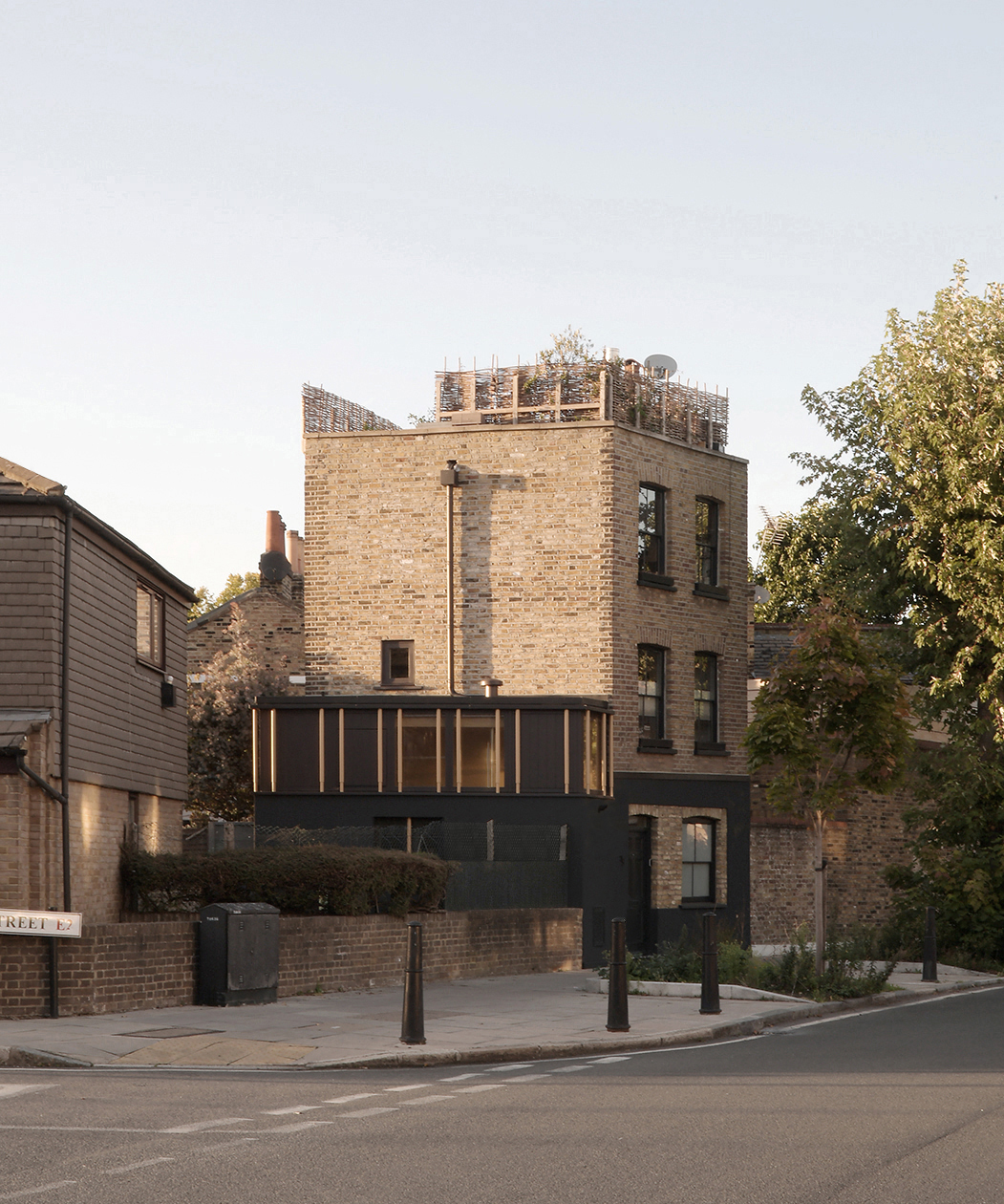 Rather it explores the pragmatic and poetic possibilities of architecture through the treatment of elemental things such as natural light, ventilation and a well-articulated façade to radically improve a unique, mid-19th century building located in East London. Prior to being converted into a single bedroom house, this standalone building formed part of a high street serving as a sweetshop, mini-cab office and tanning salon. The project alters an unsightly lean-to (originally built to house the tanning salon showers) that transforms the spatial and environmental qualities of existing internal spaces and the external appearance of the house. A new timber frame clerestory lantern is perched atop the old walls creating a characterful shoulder for the building. A dark, rough rendered plinth unifies previously separate elements. The lantern’s façade is composed from solid timber panels and glazing to flood the ground floor with natural light. An opening panel naturally ventilates the space. External insulation improves comfort. Delicate timber columns painted in accents of colour march in pairs across the new façade. This miniature frieze makes a little gift of architecture to the area that can be seen from as far away as Roman Road. The previously cramped and dark ground floor was opened up to create an airy kitchen and dining room. The fine-grain structure of the ceiling is left exposed. A new insulated and heated floor is tiled in hand cut terracotta. A salvaged terrazzo doorstep marks the threshold. A combination of new and old pieces were brought together to make a convivial house; characterful furniture combines with a freestanding stainless steel kitchen; Gentle finishes to the walls, ceilings and joinery combine with diffuse natural light to create a comfortable and calming internal atmosphere.