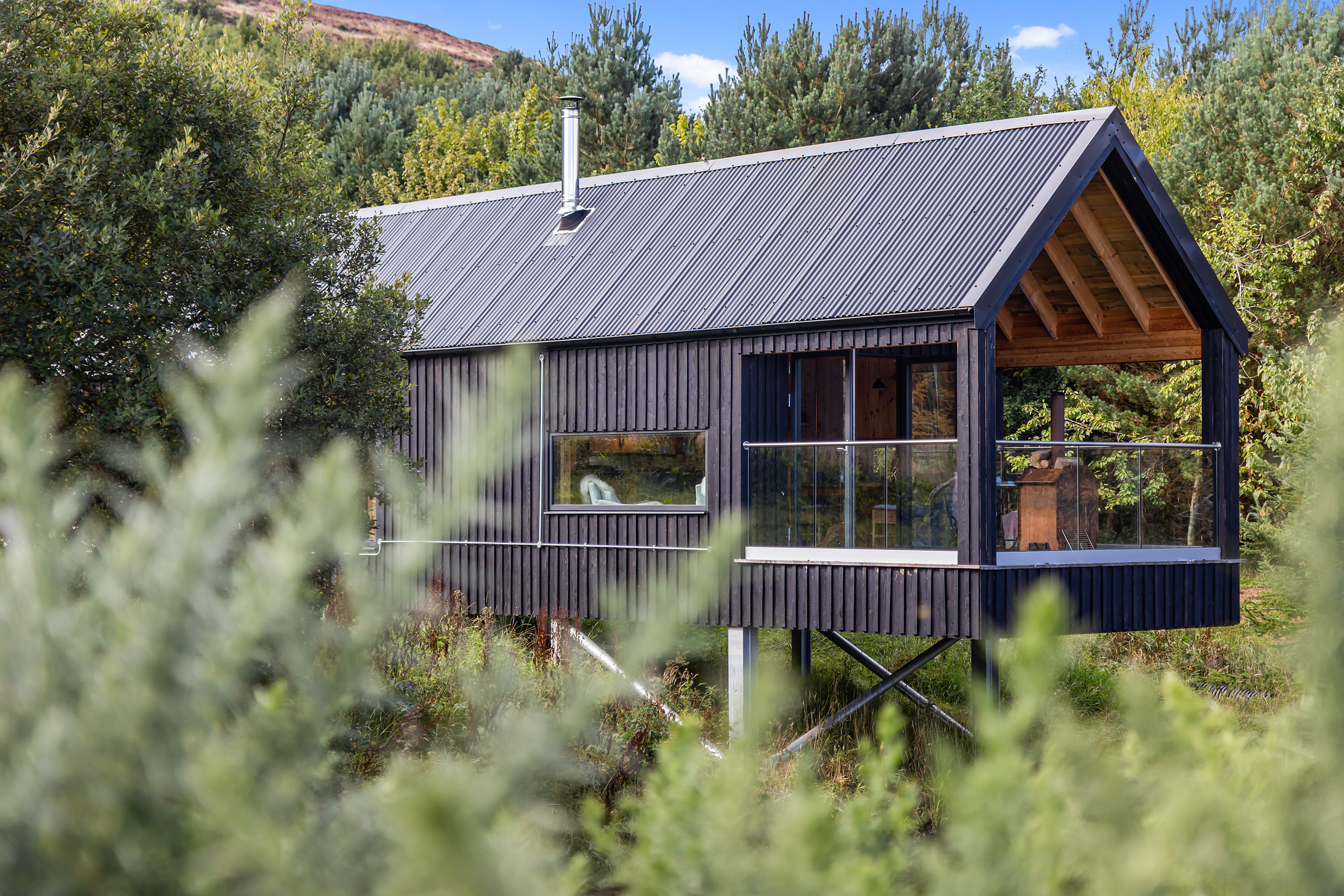 They built 3, two person retreats for stargazing, reflection and a chance to reset. • The Sheiling – A contemporary ‘bothy’, placed in a small steeply sloping wooded area. Bold cladding is screened by foliage and is glimpsed through the trees. • Bothan Dubh – Floating above the established pond, reminiscent of traditional Scottish boathouses. With a cantilevered viewing platform to experience the flora and fauna which inhabit the pond. • Whin – Inspired by bird hides it is ‘hidden’ within the existing gorse. The mirror cladding means it is all but invisible when looking from the surrounding countryside and village. A fun project with a serious message; to provide a comfortable experience of an off-grid lifestyle without the hair shirt. The outdoor spaces are as important as the indoor, with strong connection to the landscape and panoramic views. Showerrooms are outside, conjuring memories of camping when a kid. Wood fired hot tubs are open to the elements and there is the option of outdoor cooking. The retreats embody Outfield Farm’s ethos including super-insulation, low impact, local materials – water and waste treatment on site and electricity generated by the farm wind turbine. There is a local wildflower roof and Scottish larch is sourced from the sawmill a few minutes away. The buildings have minimal impact on the landscape - structures are both removable and transportable. It is a self-build project by the client, with real creative ingenuity; including a chandelier made from recycled gas canisters and towel rails crafted himself from copper piping. Services are visible so guests can see the veins and artilleries of the building often hidden behind the interior walls.