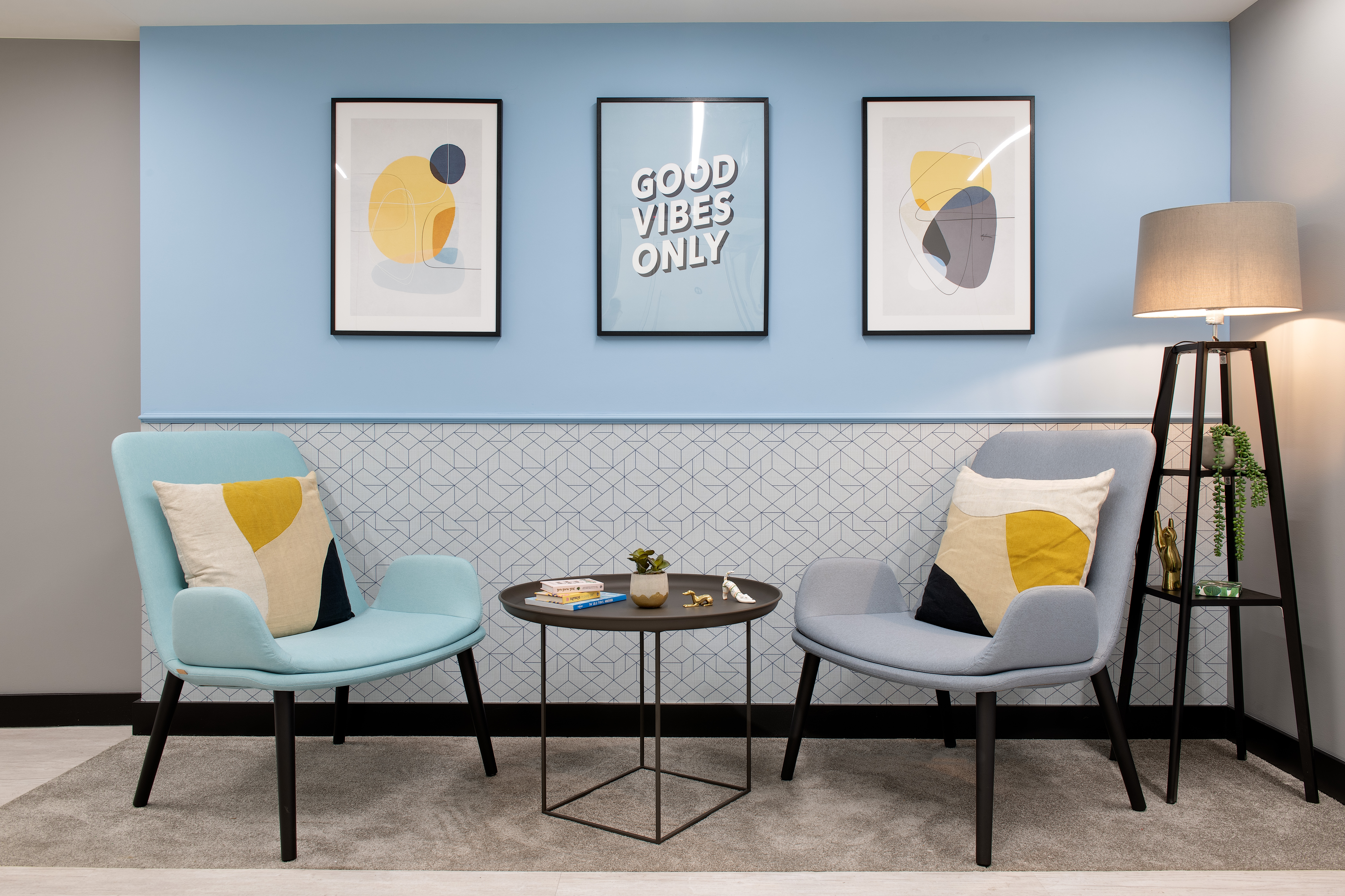 creating the ultimate high-end, sophisticated co-working space that remains true to Work.Life’s style and brand identity. It was important that the space was reflective of its location. The themed meeting rooms allowed the design team to encapsulate key locations within the Holborn area. The Hatton Garden meeting room was carefully curated to pay homage to the diamond district. This was achieved through lighting, decorative accessories and integrated typography artworks. The second meeting room sought to be representative of the biophilic nature of Lincoln’s Inn Fields, the largest public square in London. This was achieved through the integration of associated artworks and accessories. Due to this being an expansion project, the team were required to navigate a live site, ensuring the safety of residents and minimizing disturbance from noise. As a result, a strict schedule was created to ensure that public disruption was kept to a minimum whilst ensuring the project was completed on time. The team were faced with several challenges during the project, the integration of exposed services to the corridor on the second floor for example required a partial ceiling removal. Grills along the back walls of the newly converted meeting rooms posed obstacles for decorative finishes as well as the positioning of the AV equipment. Due to not being able to paint the grills, the team came up with the idea to purchase vinyl in the same colour as the walls. By cutting the vinyl to fit over the grills, a seamless look was achieved without compromising the overall functionality. Overall, through careful planning and creative solutions, the team successfully completed the Work.Life Holborn expansion, whilst incorporating the desired features and preserving the seamless look and feel of the original space.
