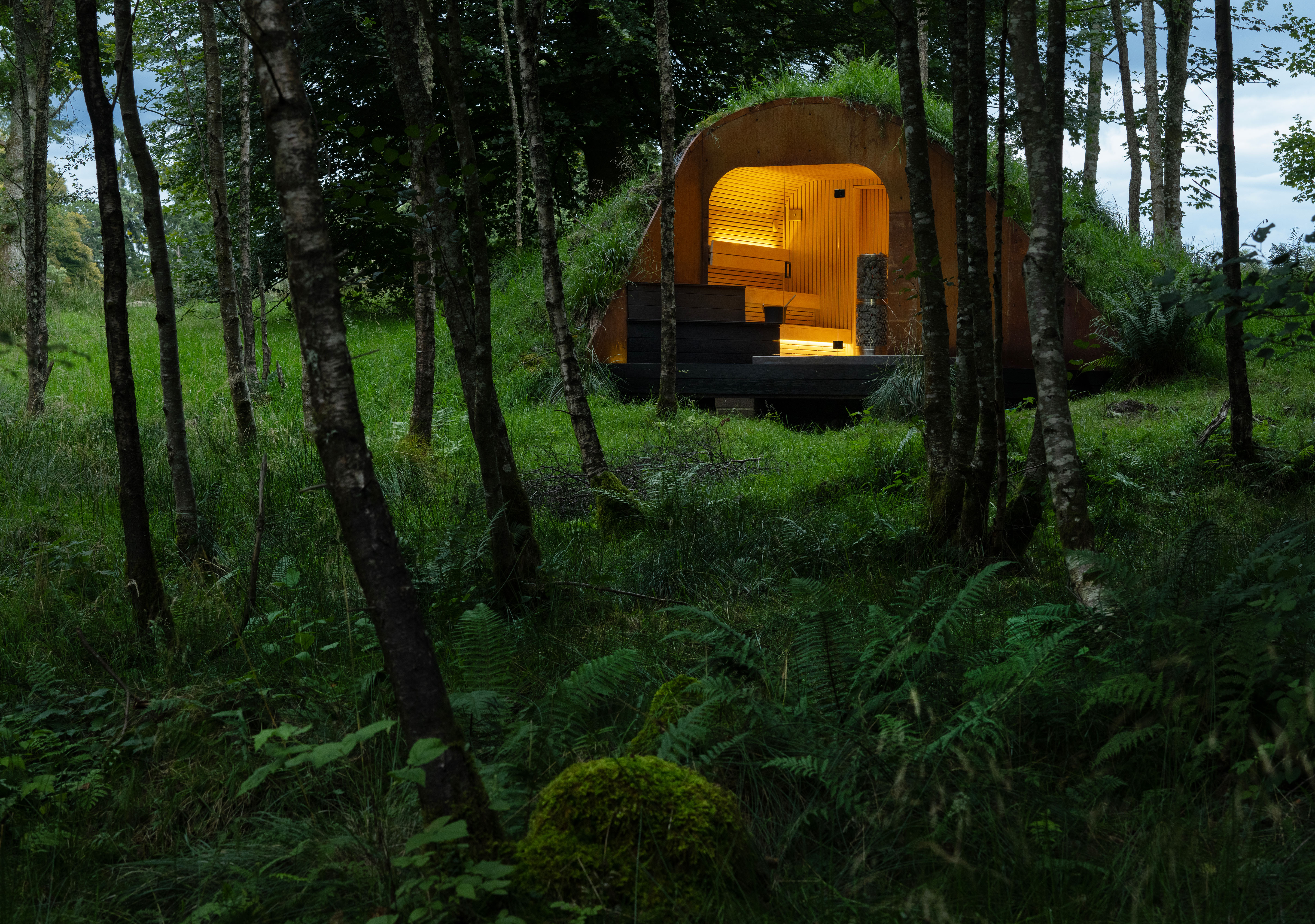 The concept - create an unassuming "door in the woods" that, when opened, reveals a sauna integrated into the landscape. The goal was to preserve the natural beauty and outlook for guests, ensuring a sense of transparency and peacefulness. Utilising homegrown materials was a crucial aspect of our design philosophy. The timber superstructures supporting the wild green roof were sourced directly from the estate, fostering a deep connection with the environment. The understated entrance, carved into the landscape, contrasted beautifully with the clean, subtly lit sauna, creating an impressive, harmonious composition. Navigating through challenges, including the constraints posed by trees, wet ground, and power and water supplies, the team adhered to a meticulously planned timetable and budget. Trial and error, along with a topographical survey, guided us in selecting the optimal site. The complexity of the design was tackled step by step. The design not only respects but celebrates the natural contours of the site, allowing the structure to seamlessly blend into the forest. From the path, all that's visible is an unassuming metal door, fostering a sense of mystery. Upon entering, occupants are transported to an intimate and unique space, with a sauna offering panoramic views of the woodland. The peaceful ambience, accompanied by birdsong and the aroma of the damp woodland floor, creates an unforgettable and calming experience. Inclusive design principles were paramount in meeting the needs of diverse users. The careful consideration of the site's topography, mock-ups of bench footprints, and a focus on details during construction ensured an inclusive space.