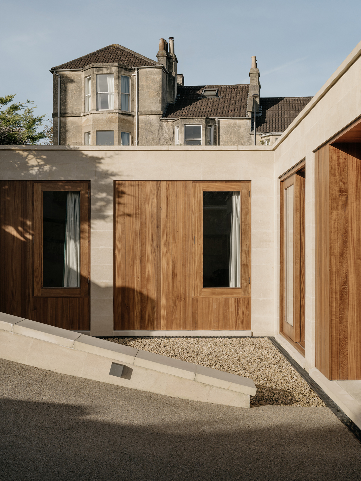 Robustly constructed of a rich palette of natural materials, the flexible internal spaces create a new home for a busy family. The landlocked nature of the site and an interrogation of the client brief prompted designs for a modest three bedroom dwelling ranged around two courtyard gardens. Internally an enfilade of spaces allows glimpsed long views through rooms to the courtyards and creates a rich, ever changing light within the house. Vast concealed sliding doors enable the flexible reconfiguration of living spaces, allowing for different family activities to coexist peacefully and creates a sense of generosity that belies the house’s diminutive footprint. The construction reuses sections of the previous garage structure, a practical approach to reducing embodied carbon and disruption to neighbours. This creative reuse is supplemented by the use of everyday and local materials which, together with long standing relationships with local contractors and craftspeople, have enabled the construction of a durable and high performing new home on a limited budget. Delight is derived from the use of thoughtfully selected materials carefully assembled by skilled craftspeople including Bath ashlar stone sourced from a local quarry. The fenestration is generous in scale and deeply recessed, creating a rich play of shadows across the facades. The robust timber windows, made by a local joiner, flood natural light deep into the rooms. Internally the roof timbers are exposed, adding height and texture to the spaces. With a view to improving biodiversity on the previously barren site, the new wildflower meadow roof was soon a mass of swaying grasses and tiny yellow flowers. The new building carefully negotiates the complexities of the small site, whilst creating a robust but warm new home which is gracefully weathering family life.