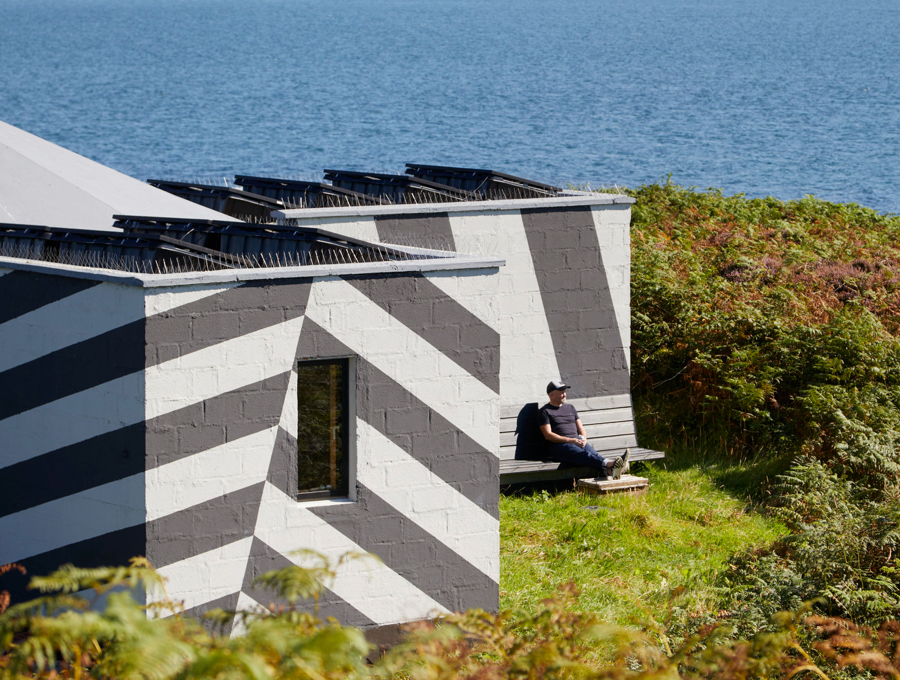 Our project brief was to principally retrofit, refurbish, and reimagine the existing structure as a new off-grid family retreat. Internally the project ambition aims to exploit the visual and physical connection to the spectacular surrounding landscape and seascapes. Peculiar in its existing form, the project considered opportunities to cost effectively reimagine its exterior. Inspired by Norman Wilkinson’s WW1 dazzle camouflage warship patterns, the project utilised a suite of high-performance mineral paint coatings to provide a long-term coastal weatherproof solution while ‘playing games’ with visual geometry and perception of its form. The project is completely off-grid and implemented zero-carbon renewable technologies; solar array with deep cycle lead acid battery bank providing sustainable electrical demand for heating, hot water, and general small power for the refurbished building. Rainwater Harvesting with UV sterilisation provides non-potable water for domestic use. The thermal upgrade to external walls and roof maximises thermal performance whilst a full replacement of the existing single glazed timber framed windows and doors to a VELFAC Alu-Clad system offers greatly improved performance and mitigates maintenance issues. Wooden linings were specified internally throughout for aesthetic value, wellbeing quality, and tactility. The timber panel’s hygroscopic moisture buffer properties also helped stabilise humidity within the building especially when unoccupied. The remote island location presented many construction and design challenges. Issues such as primary access to the site and shifting weather patterns required a necessity for a phased approach to the works over several summer seasons. Issues with delivery of materials, generally made by small boat or by helicopter, meant careful consideration and constraint to the design specification. Throughout the design the project adopted products with a long design life and with low maintenance requirements.