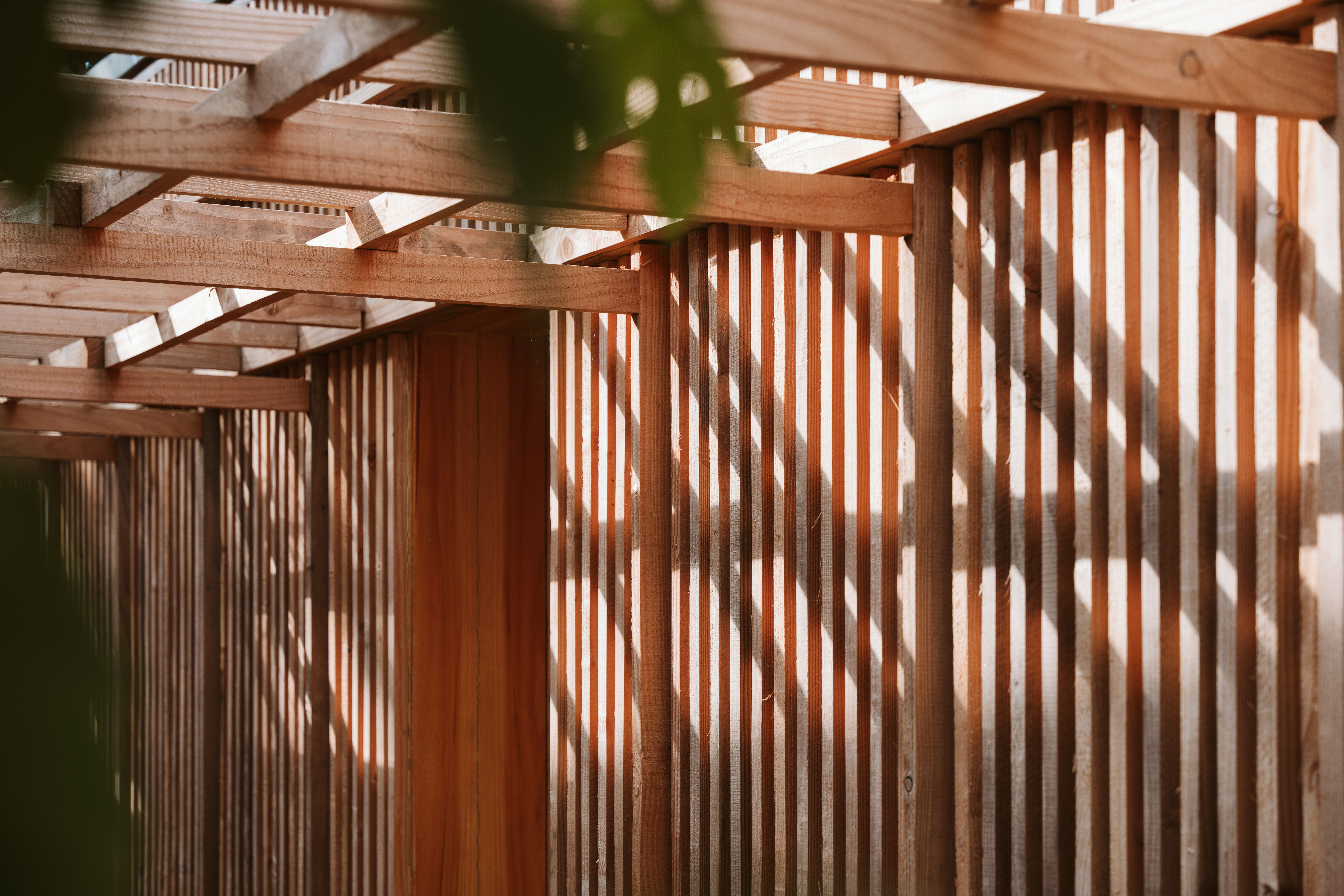 We experimented with two main building systems forming the building envelope; the building’s enclosing and forming elements (i.e. internal and external walls, roof deck, dropped ceilings) and the external timber rainscreen cladding. The former was constructed as a kit-of-parts - to be CNC'd from plywood sheets - developed by Neutral Projects. This project was intended to test at a small scale what would be possible at a larger, multistorey scale. And, this is where the system departed from other kit-of-parts systems. We designed the building enclosure as a solid - but non-loadbearing - framework to accept a series of load-bearing glulam columns and a ring beam. No setting out or special equipment was required. The columns slotted right into their place; the CNC kit located them precisely and ensured their verticality. This sequence of installation, i.e infill first, post and beam after, reverses the traditional sequence. The facade is imagined as a three dimensional threshold between the exterior and interior. The vertical board-on-board and locally sourced Douglas fir timber rainscreen and the trellis are conceived as a single element. Together they clad the building, frame views out to the garden from the interior and provide solar shading to the glazing behind. For the facade, we designed a dynamic jig - itself assembled from a series of CNC-cut plywood parts - to complete the cladding in panels rather than installing each board one-by-one as is the tradition. All cladding panel types, both ‘standards’ and ‘specials’ could be produced by a single jig by swapping in or out small parts.